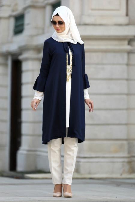 New Kenza - Payet Detaylı Tunik / Hırka Lacivert Tesettür Takım 5050L
