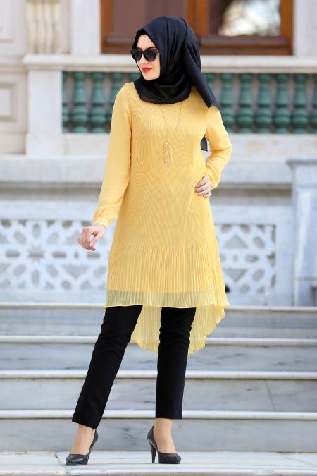 New Kenza - Pliseli Sarı Tesettür Tunik 20980SR