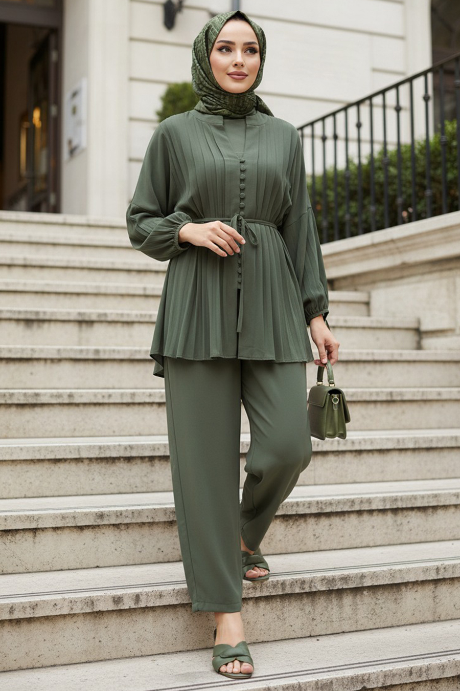 Pile Detaylı Haki Tesettür İkili Takım 19031HK