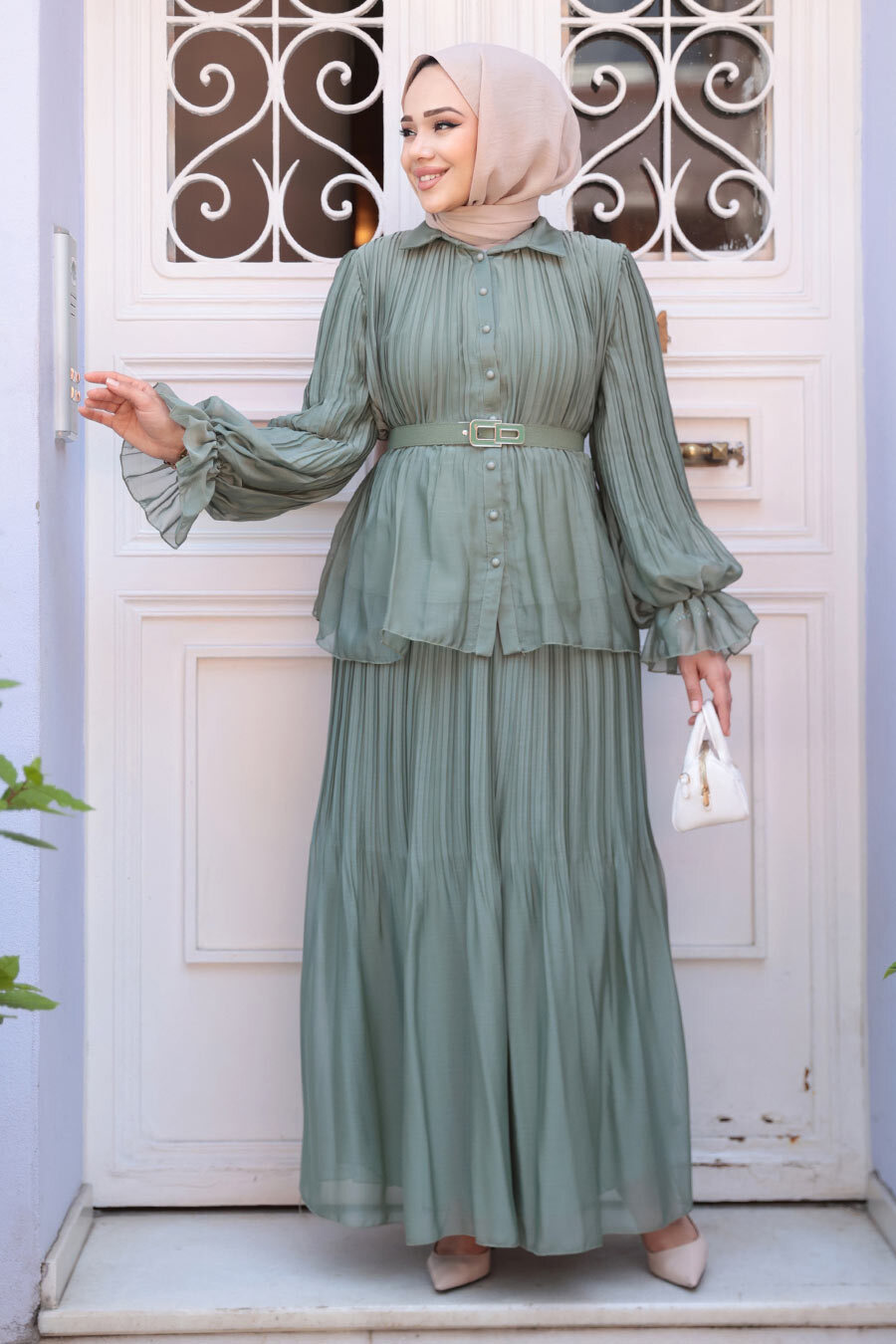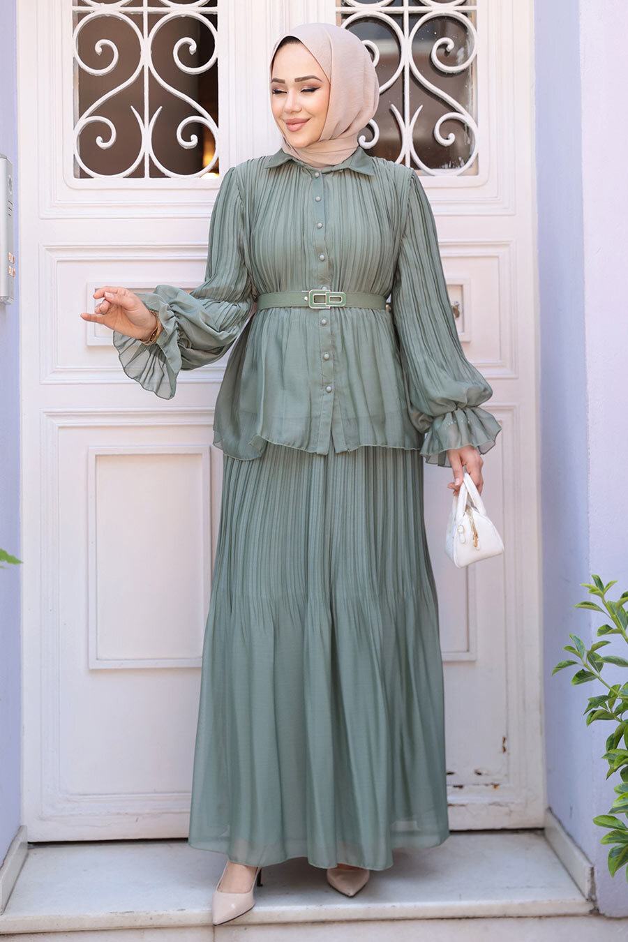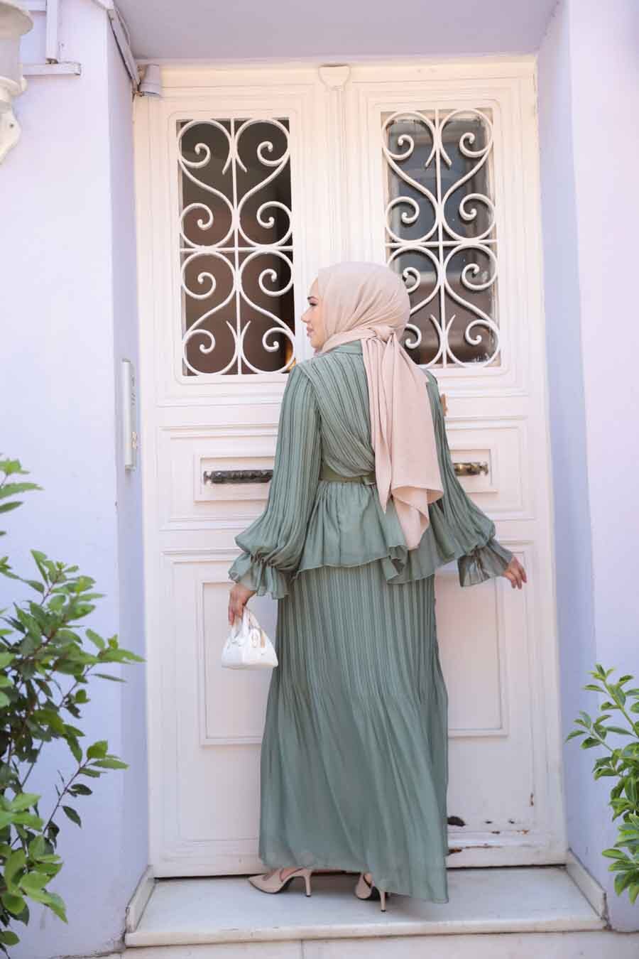 Ürün Özelliği: Klasik yaka, uzun kollu, kol ucu lastikli, kol ucu volanlı, ön ortan düğmeli, pileli, tokalı kemerli, eteği belden lastikli, pileli, etek ucu volanlı ve astarlıdır.