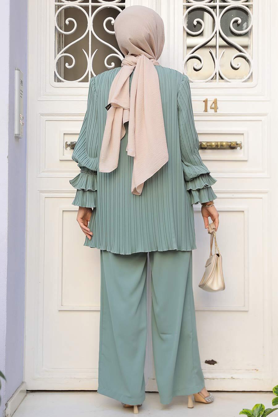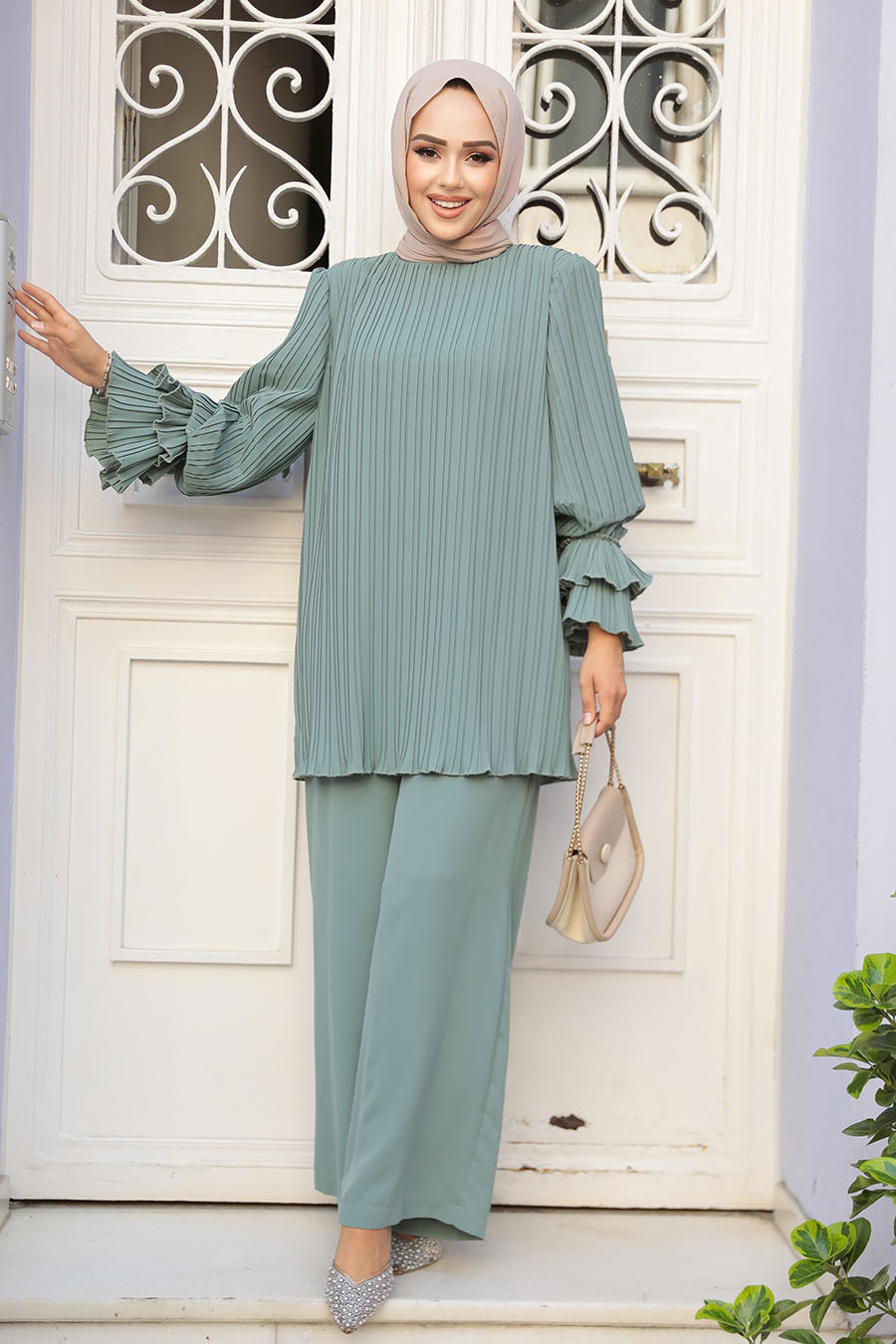 Ürün Özelliği: Sıfır yaka, uzun kollu, omuzları büzgülü, kol ucu volanlı, pileli ve pantolon geniş paçadır.Ürün Boyu: Üst:80 cm Alt:105 cmÜrün Rengi: Çağla Yeşili-Life Style çekimlerden dolayı ürün renginde ton farkı olabilirSipariş İçeriği: Bu ürün takım olarak satılmaktadır. Takım tunik ve pantolondan oluşmaktadır.Numune Bedeni: 38 BedenYıkama: 30 derecede sıktırmadan yıkanabilir.