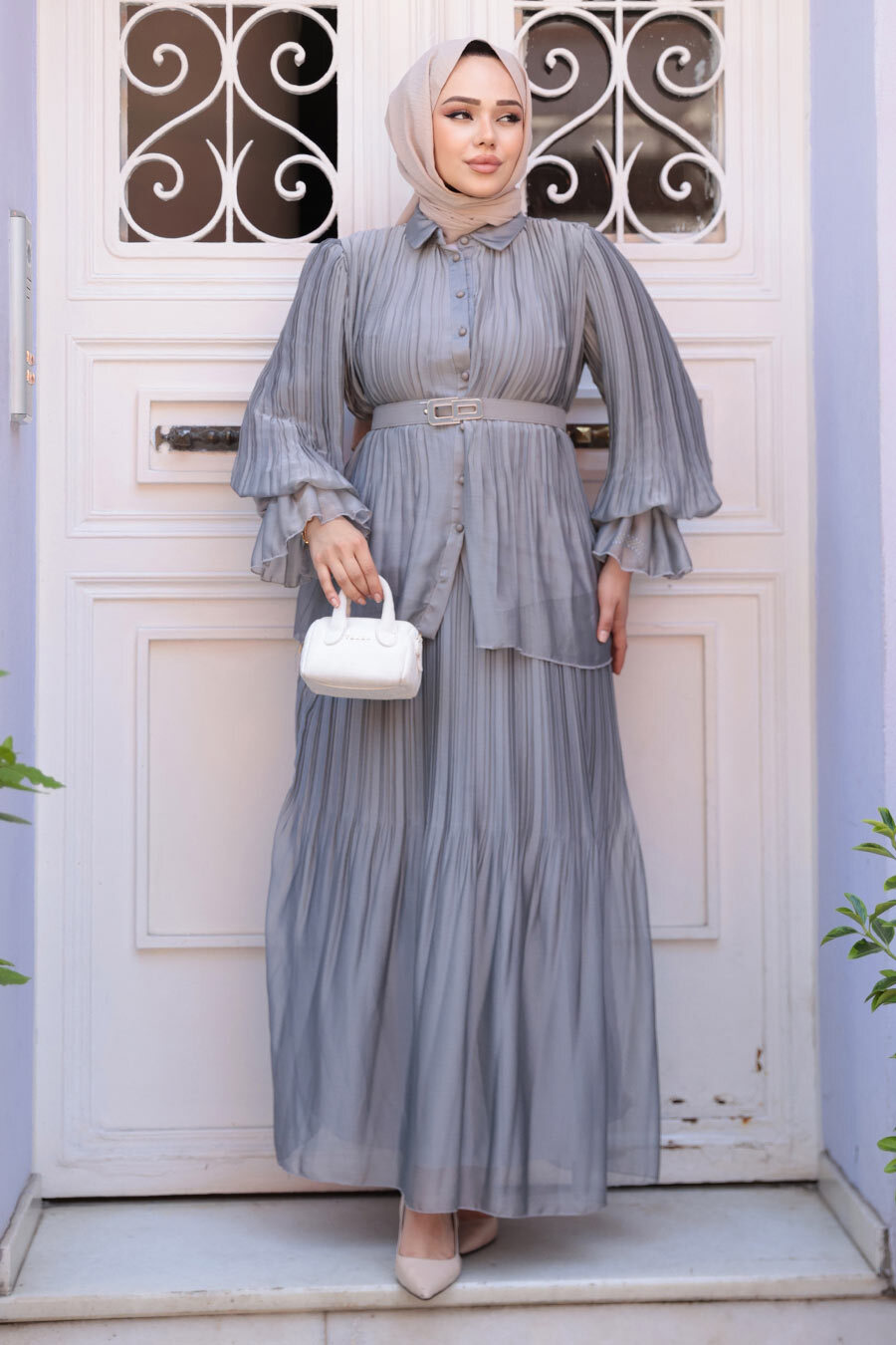 Ürün Özelliği: Klasik yaka, uzun kollu, kol ucu lastikli, kol ucu volanlı, ön ortan düğmeli, pileli, tokalı kemerli, eteği belden lastikli, pileli, etek ucu volanlı ve astarlıdır.