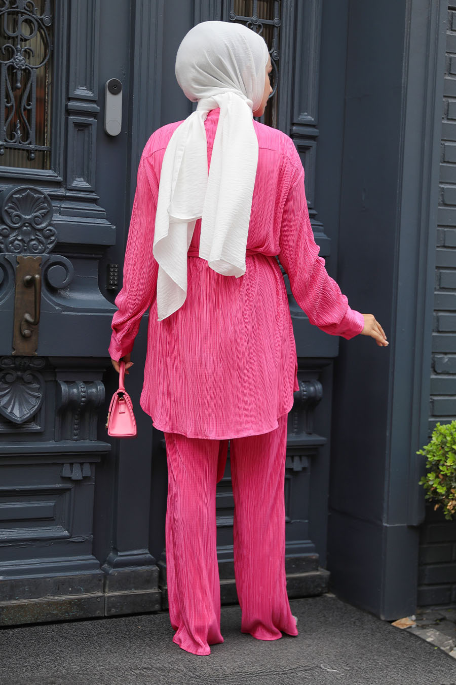 Kumaş Özelliği: %100 Polyester kumaştan üretilmiştir.Ürün Özelliği: Klasik yaka, uzun kollu, manşetli, tokalı kemerli, pileli, ön ortadan düğmeli, pantolon belden lastikli ve boru paçadır.