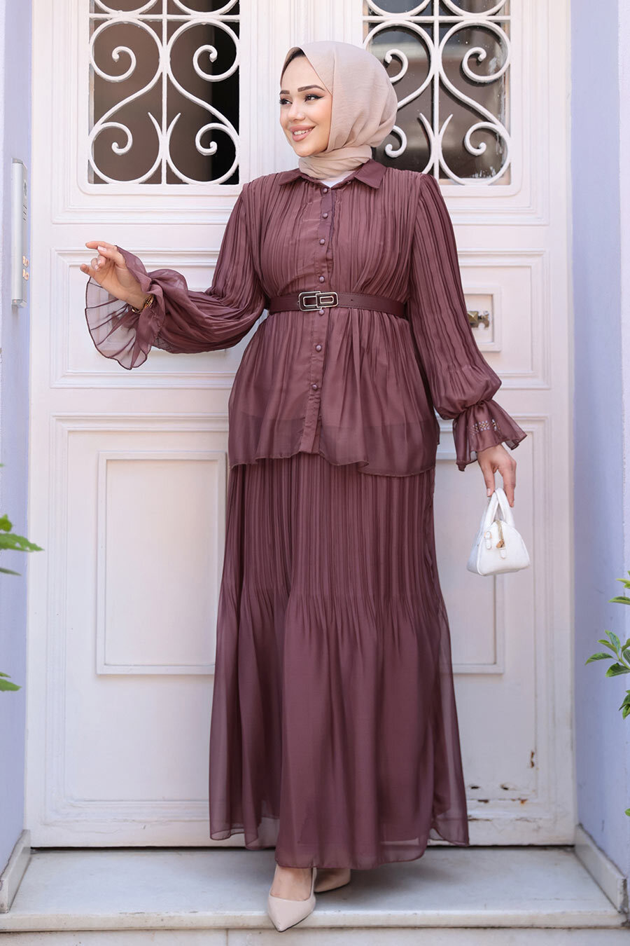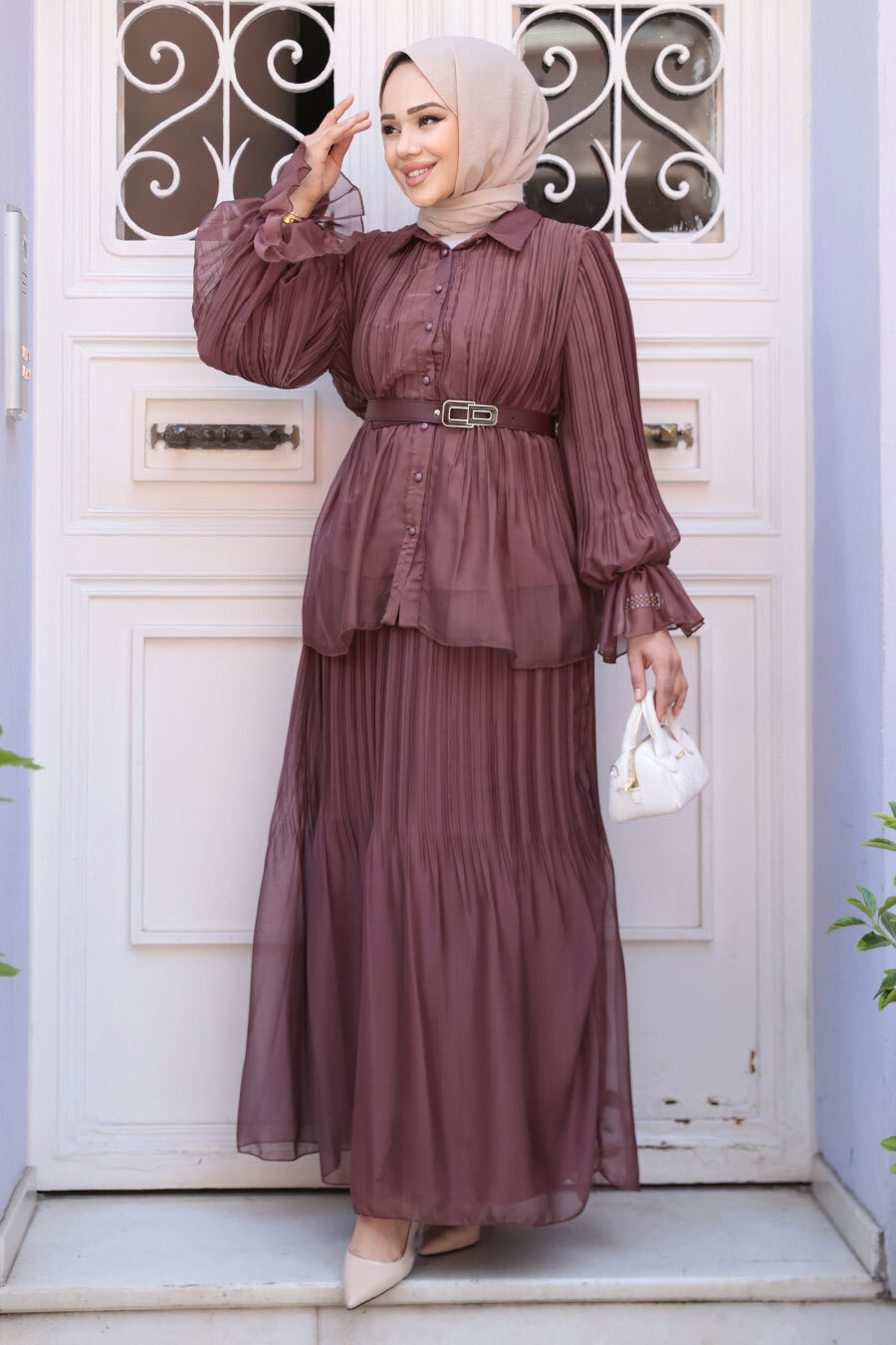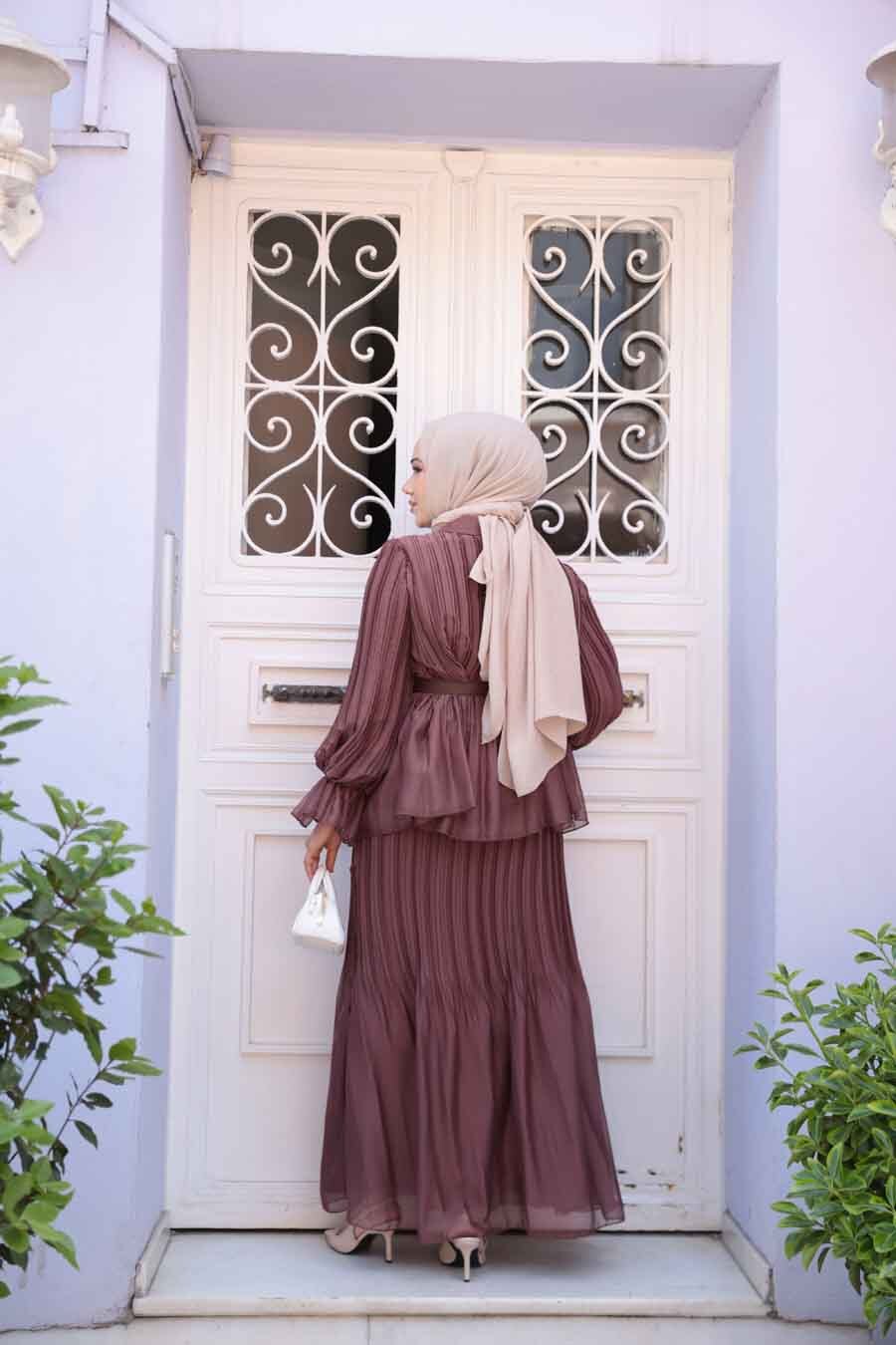 Ürün Özelliği: Klasik yaka, uzun kollu, kol ucu lastikli, kol ucu volanlı, ön ortan düğmeli, pileli, tokalı kemerli, eteği belden lastikli, pileli, etek ucu volanlı ve astarlıdır.