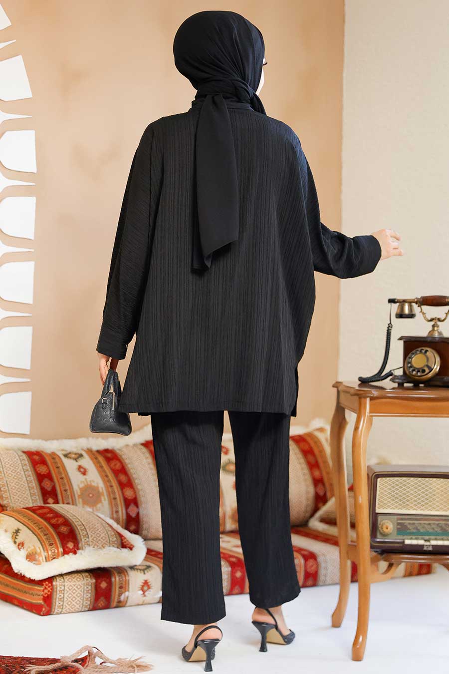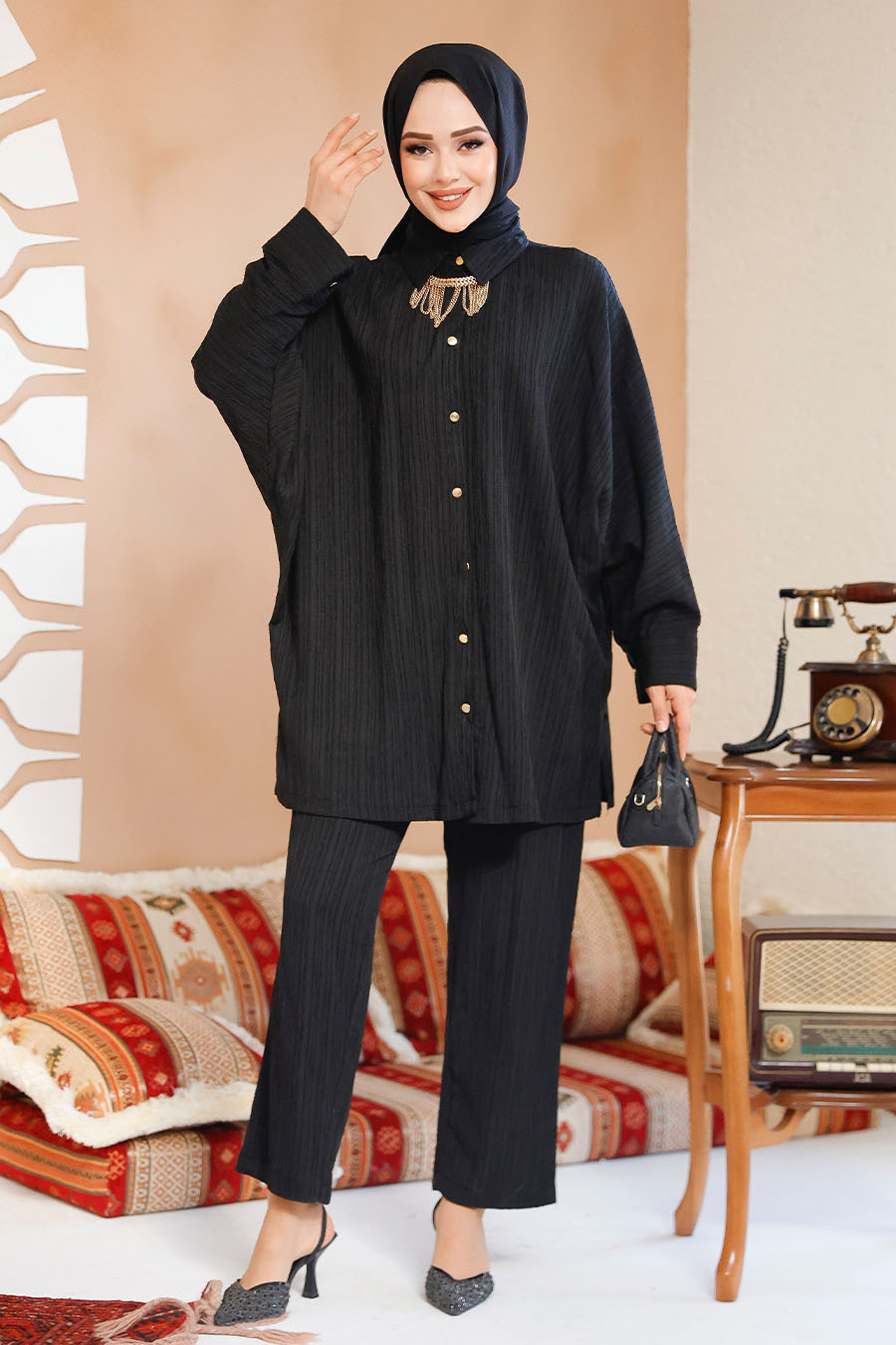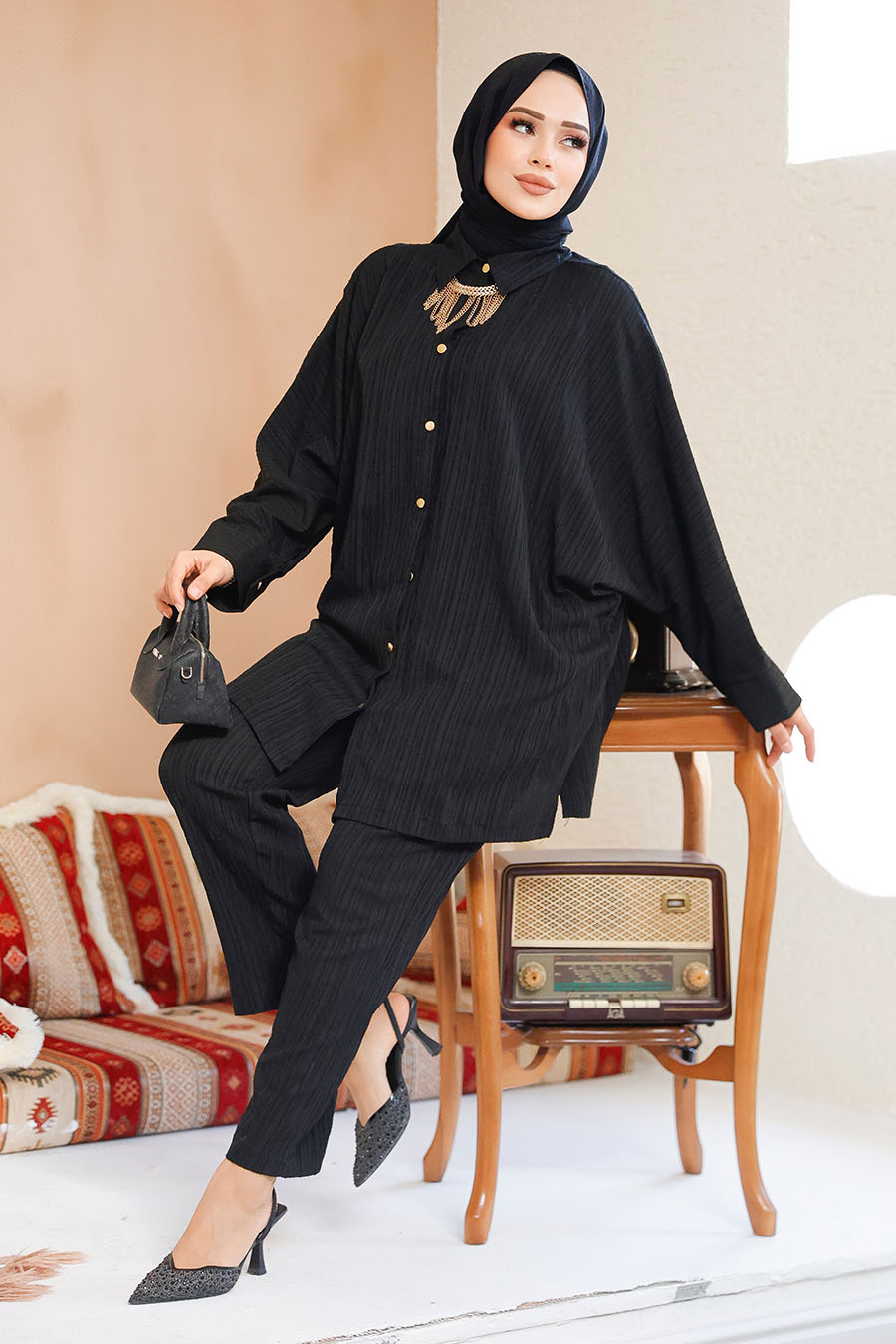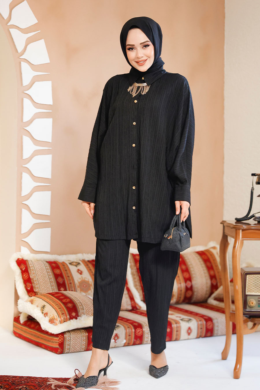 Ürün Özelliği: Klasik yaka, uzun kollu, pileli, ön ortadan düğmeli, pantolon belden lastikli ve dar paçadır.