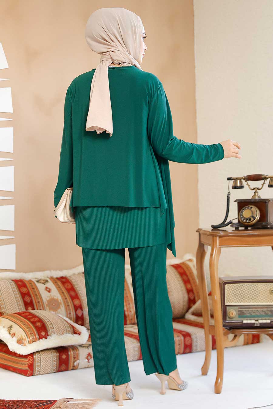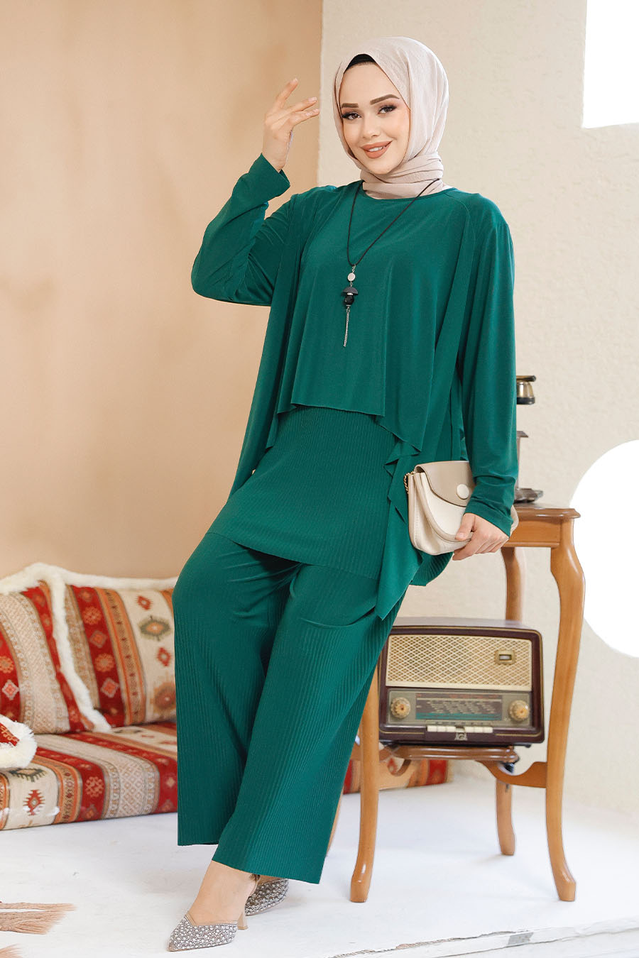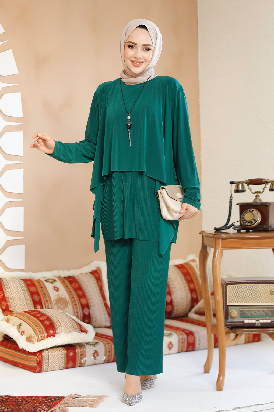 Ürün Özelliği: Sıfır yaka, uzun kollu, pileli, kolyeli, asimetrik detaylı, pantolon belden lastikli, pileli ve boru paçadır.