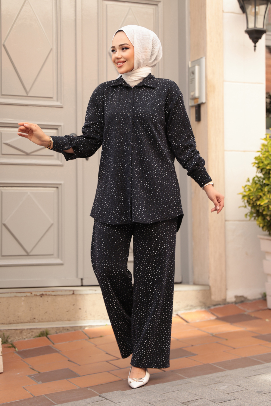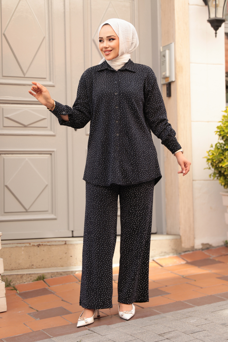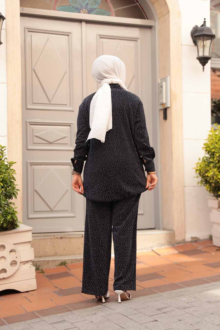 Ürün Özelliği: Klasik yaka, uzun kollu, manşetli, ön ortadan düğmeli, taşlı, pantolon belden lastikli ve boru paçadır.