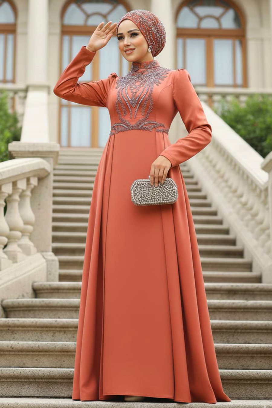 Ürün standart kalıp olup normalde kullandığınız bedeni sipariş vermeniz tavsiye olunur. Özel günler, düğün, nişan, söz, davet ve mezuniyet için aradığınız tesettürlü abiye elbisedir.