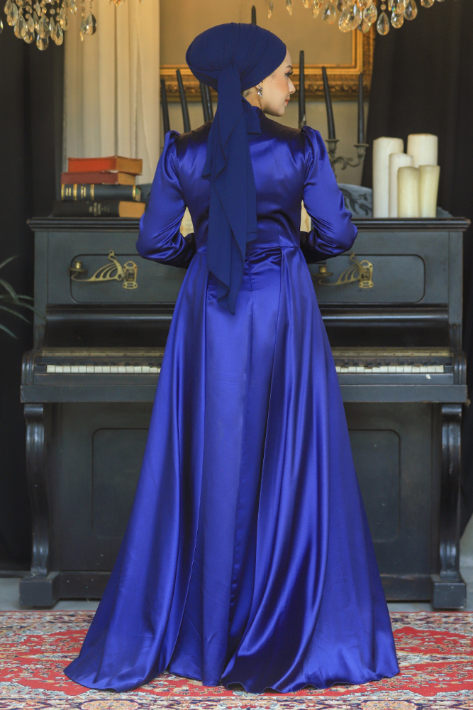 Long Sleeve İndigo Blue Muslim Evening Dress 55621IM