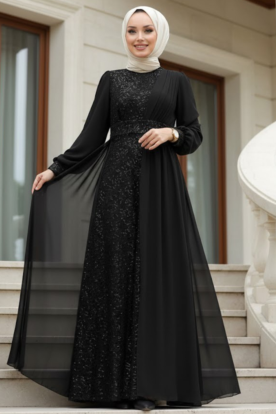 Ürün Özelliği: Sıfır yaka, uzun kollu, manşetli, payet işlemeli, şifon detaylı, arka ortadan fermuarlı ve astarlıdır.