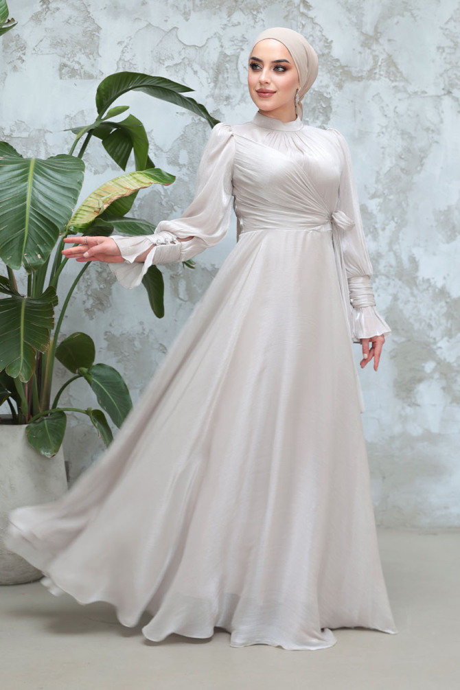 Tesettürlü Abiye Elbise - Bağlama Detaylı Taş Tesettür Abiye Elbise 48051TAS