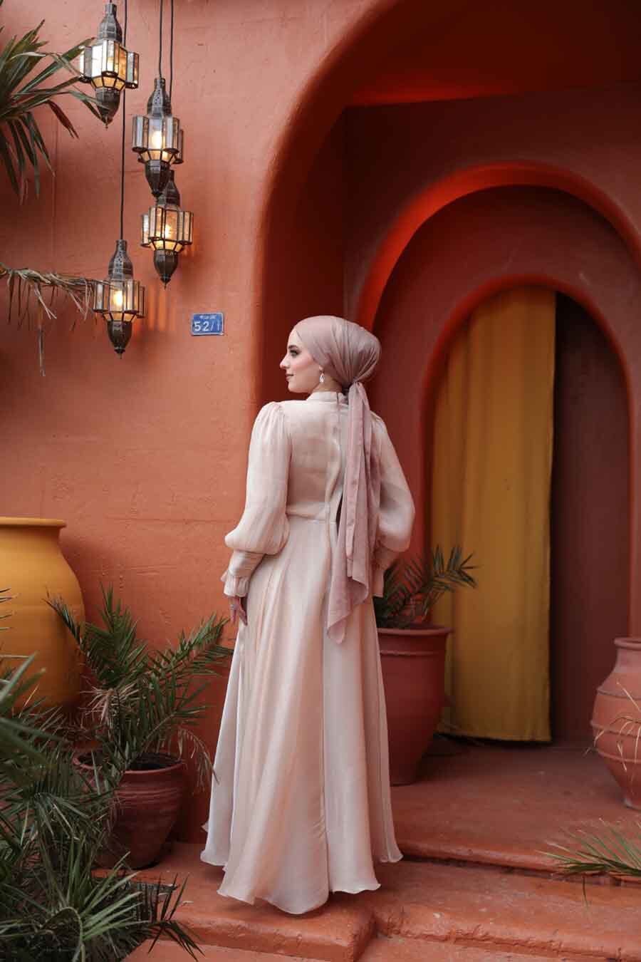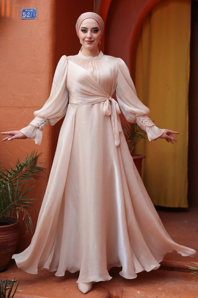 Tesettürlü Abiye Elbise - Bağlama Detaylı Ten Tesettür Abiye Elbise 48051TEN