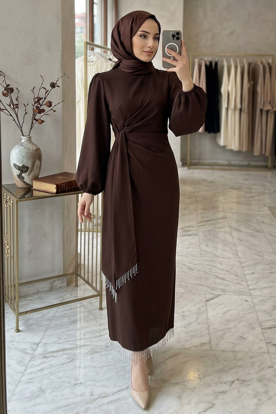 Ürün Rengi: Koyu KahverengiLife Style çekimlerden dolayı ürün renginde ton farkı olabilir Sipariş İçeriği: Bu ürün kombin değildir. Sadece abiyeden oluşmaktadır. Numune Bedeni: 38 Yıkama: Yalnızca kuru temizleme yapılabilir.