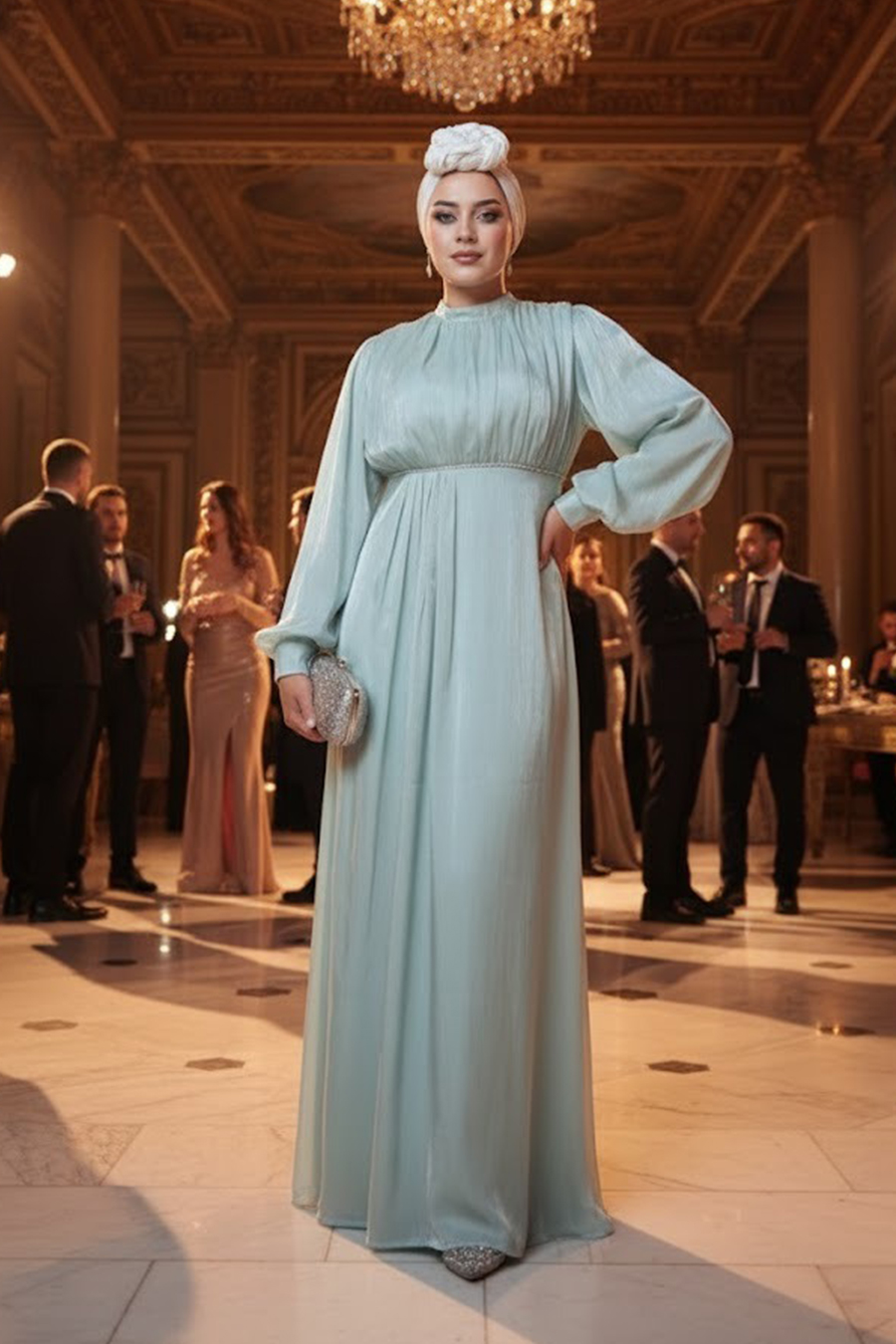 Ürün Özelliği:Dik yaka, uzun kollu, balon kol, manşetli, drape detaylı, beli boncuk detaylı, arka ortadan fermuarlı ve astarlıdır.
