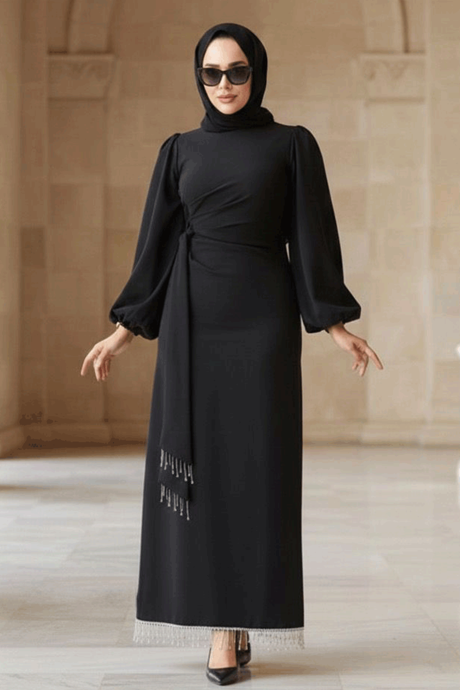 Ürün Özelliği:Sıfır yaka, uzun kollu, kol ucu lastikli, balon kol, drape detaylı, yandan bağlamalı, püskül boncuk detaylı ve arka ortadan fermuarlıdır.