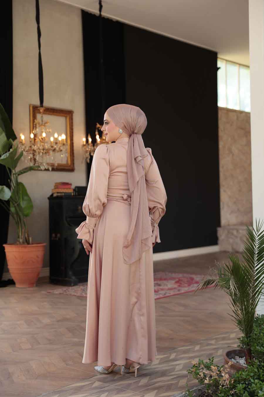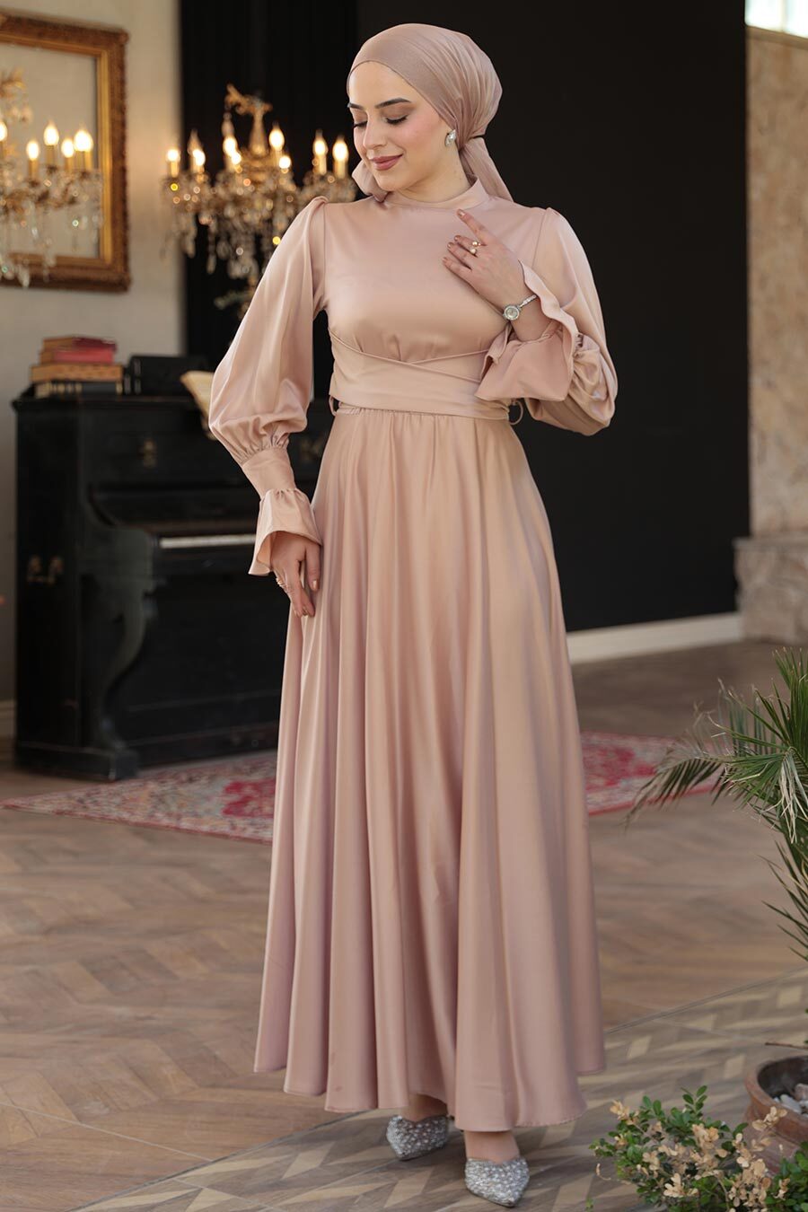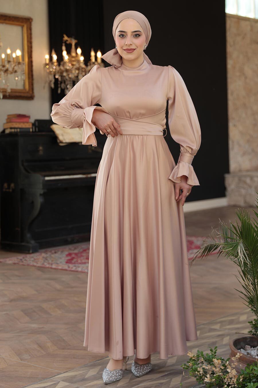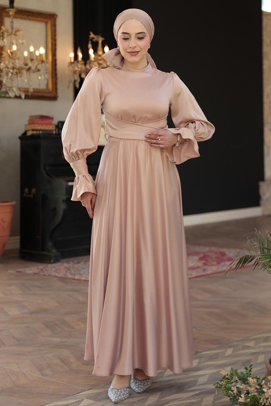 Tesettürlü Abiye Elbise - Bisküvi Tesettür Saten Abiye Elbise 5983BS