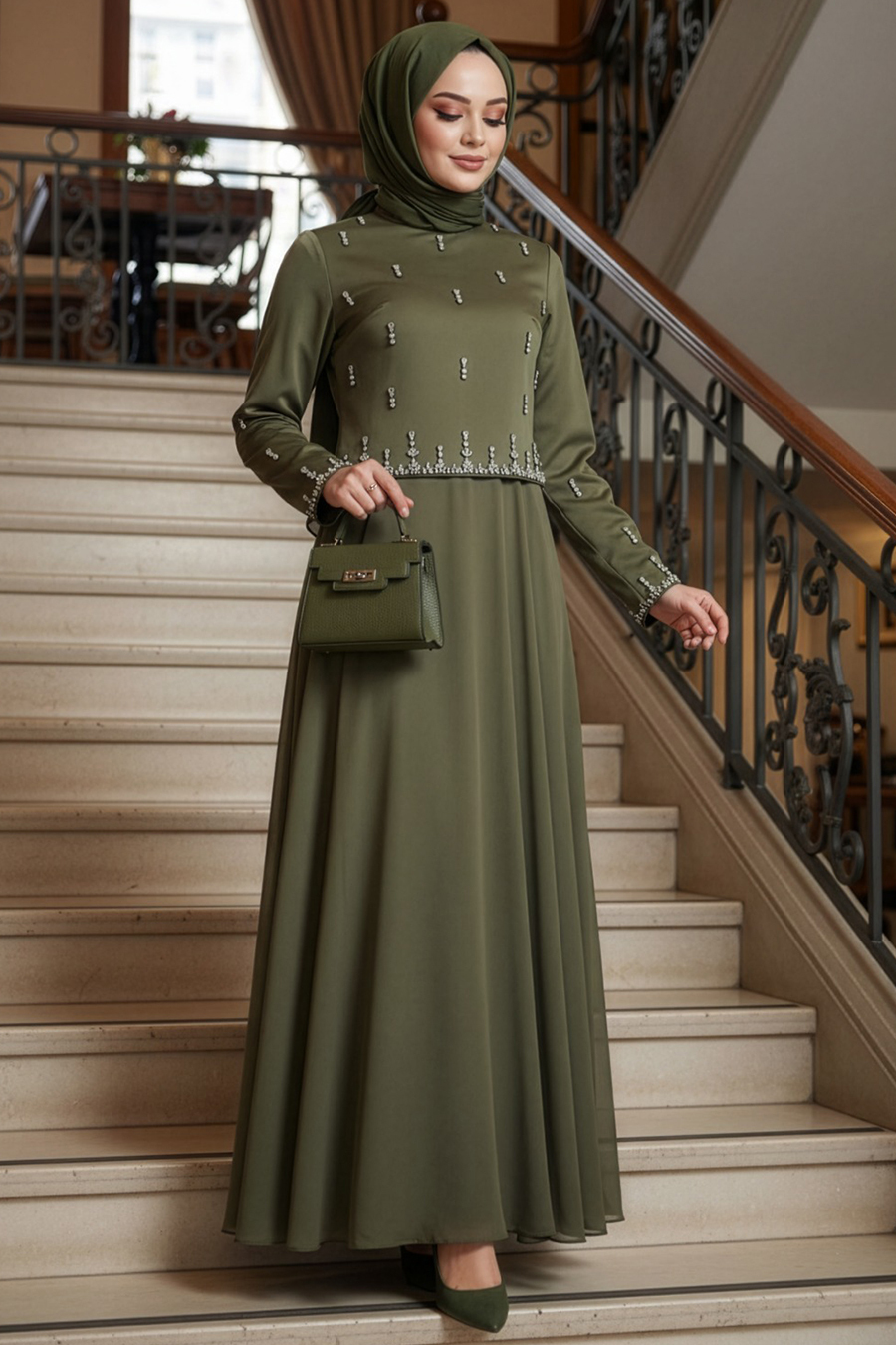 Ürün Özelliği:Dik yaka, uzun kollu, boncuk işlemeli, astarlı ve arka ortadan fermuarlıdır.