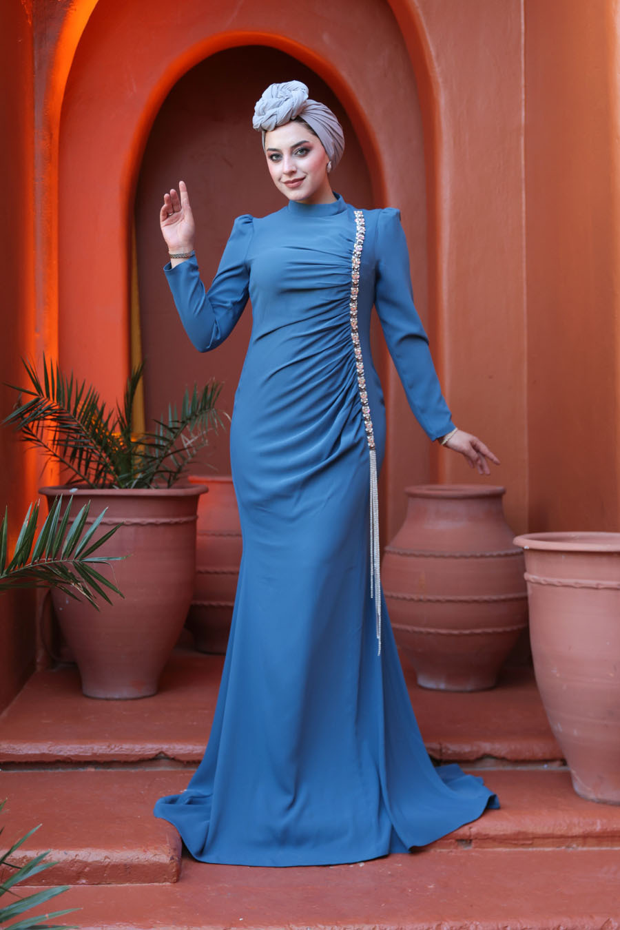 Tesettürlü Abiye Elbise - Boncuk Detaylı İndigo Mavisi Tesettür Abiye Elbise 49651IM