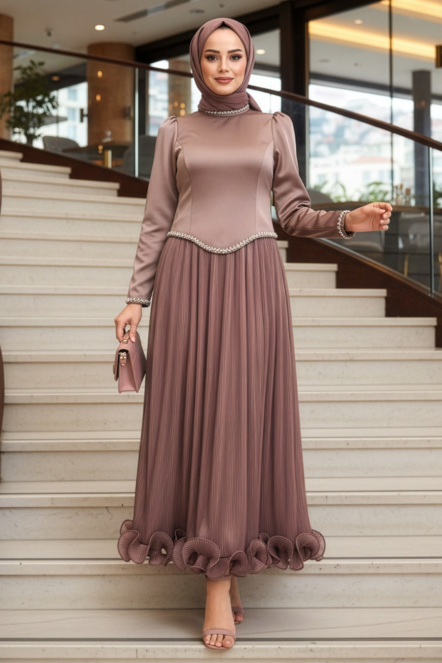 Ürün Özelliği: Dik yaka, uzun kollu, omuzları büzgülü, boncuk detaylı, eteği pileli ve arka ortadan fermuarlıdır.