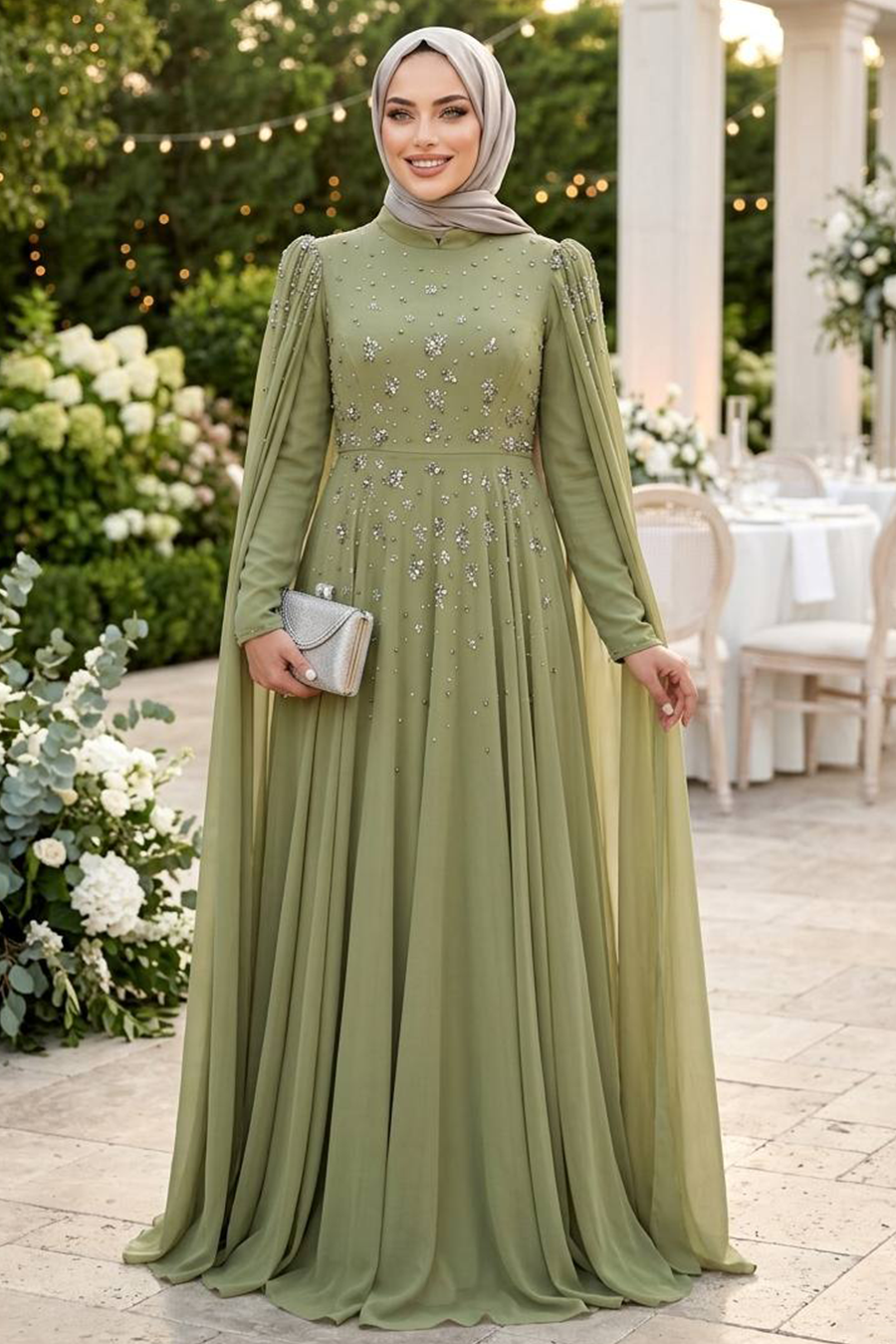 Ürün Özelliği:Dik yaka, uzun kollu, boncuk işlemeli, omuzları pelerin detaylı, astarlı ve arka ortadan fermuarlıdır.