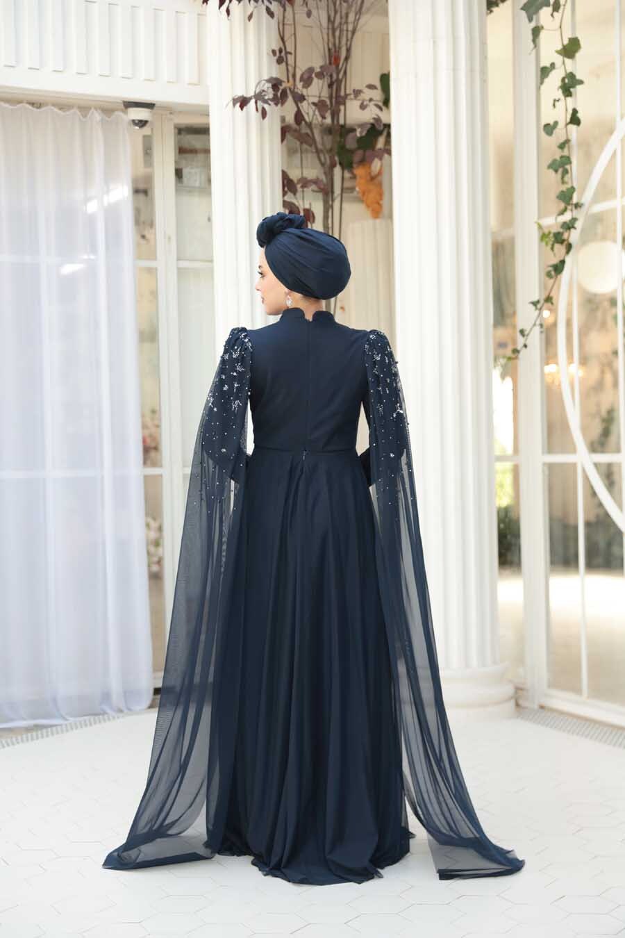 Ürün Özelliği:Dik yaka, uzun kollu, boncuk işlemeli, omuzları pelerin detaylı, astarlı ve arka ortadan fermuarlıdır.