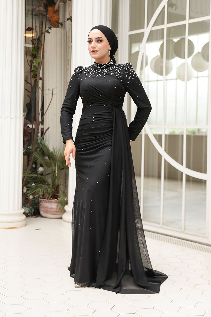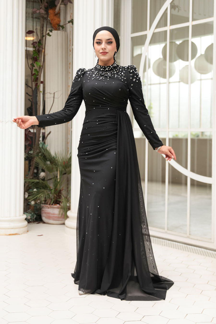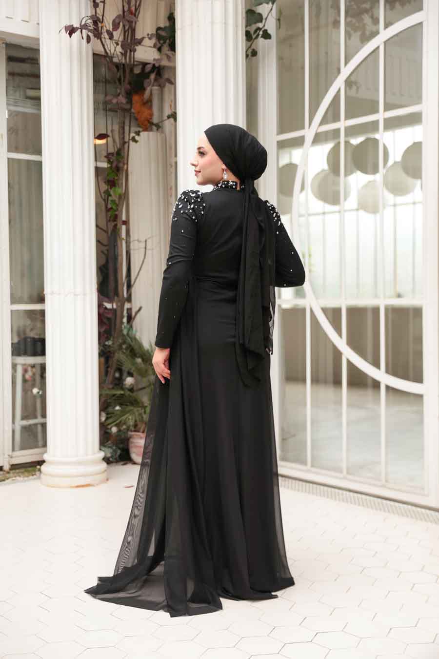 Ürün Özelliği:Dik yaka, uzun kollu, omuzları büzgülü, boncuk işlemeli, arka ortadan fermuarlı, astarlı ve yanda kuyruk detaylıdır.