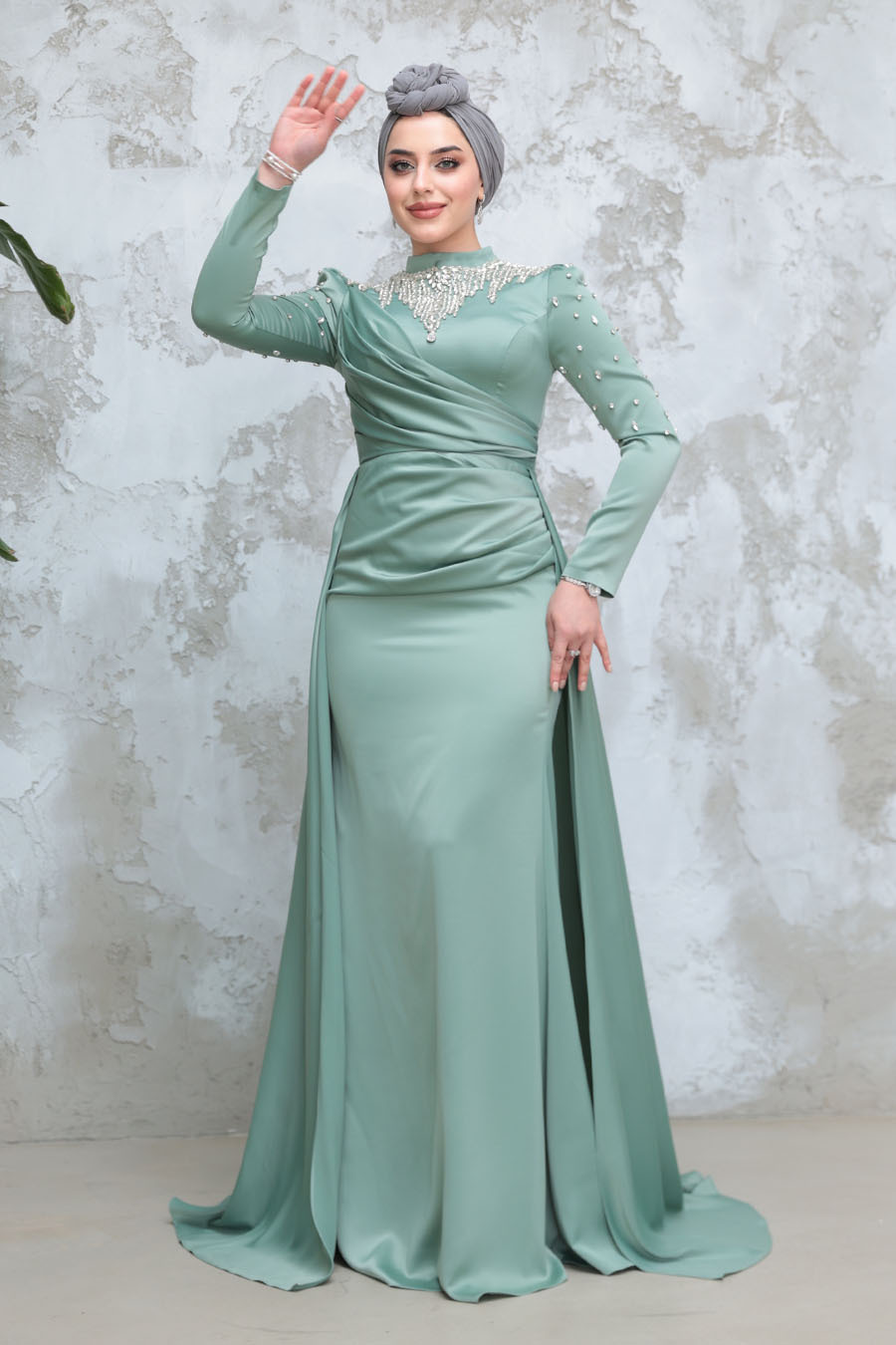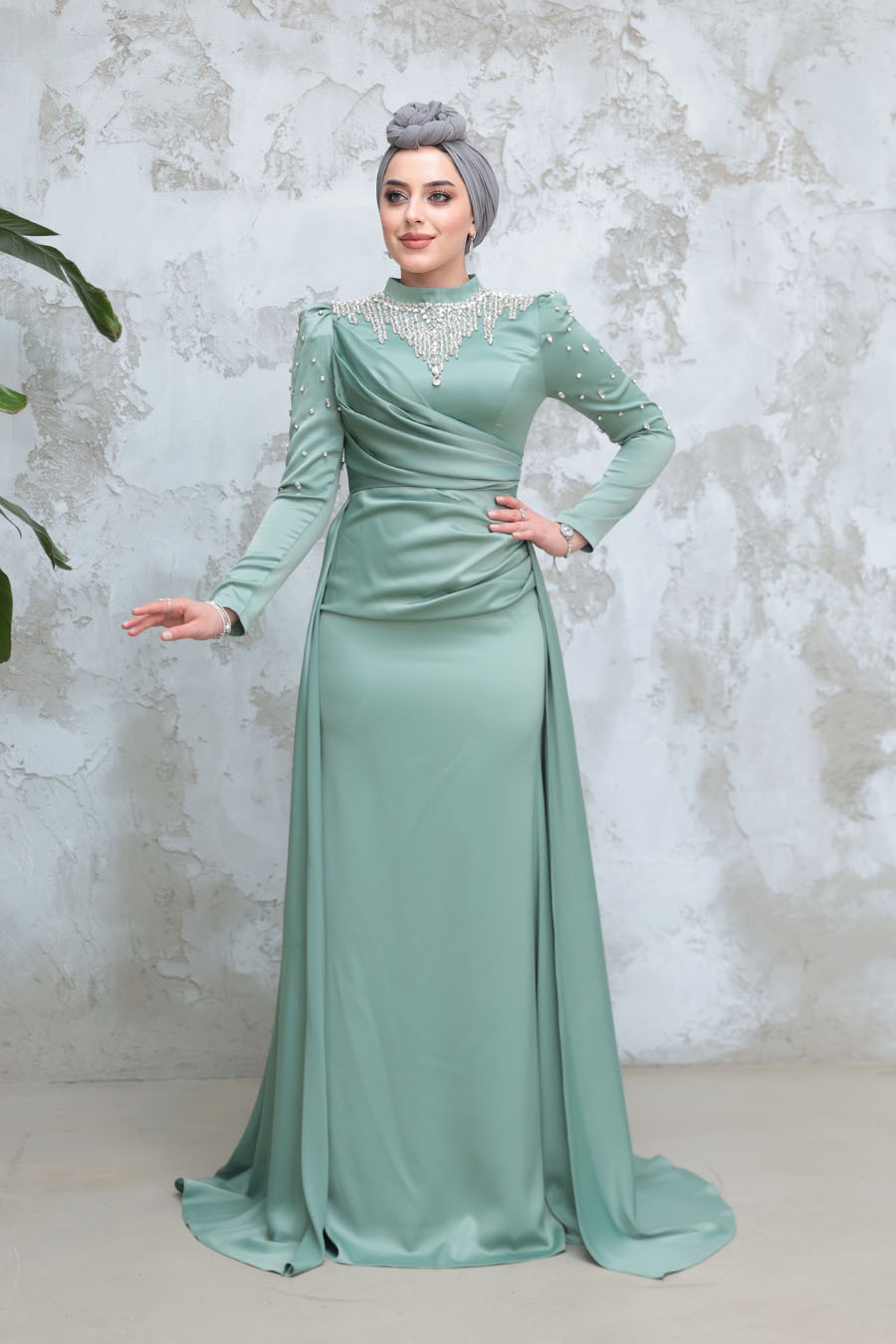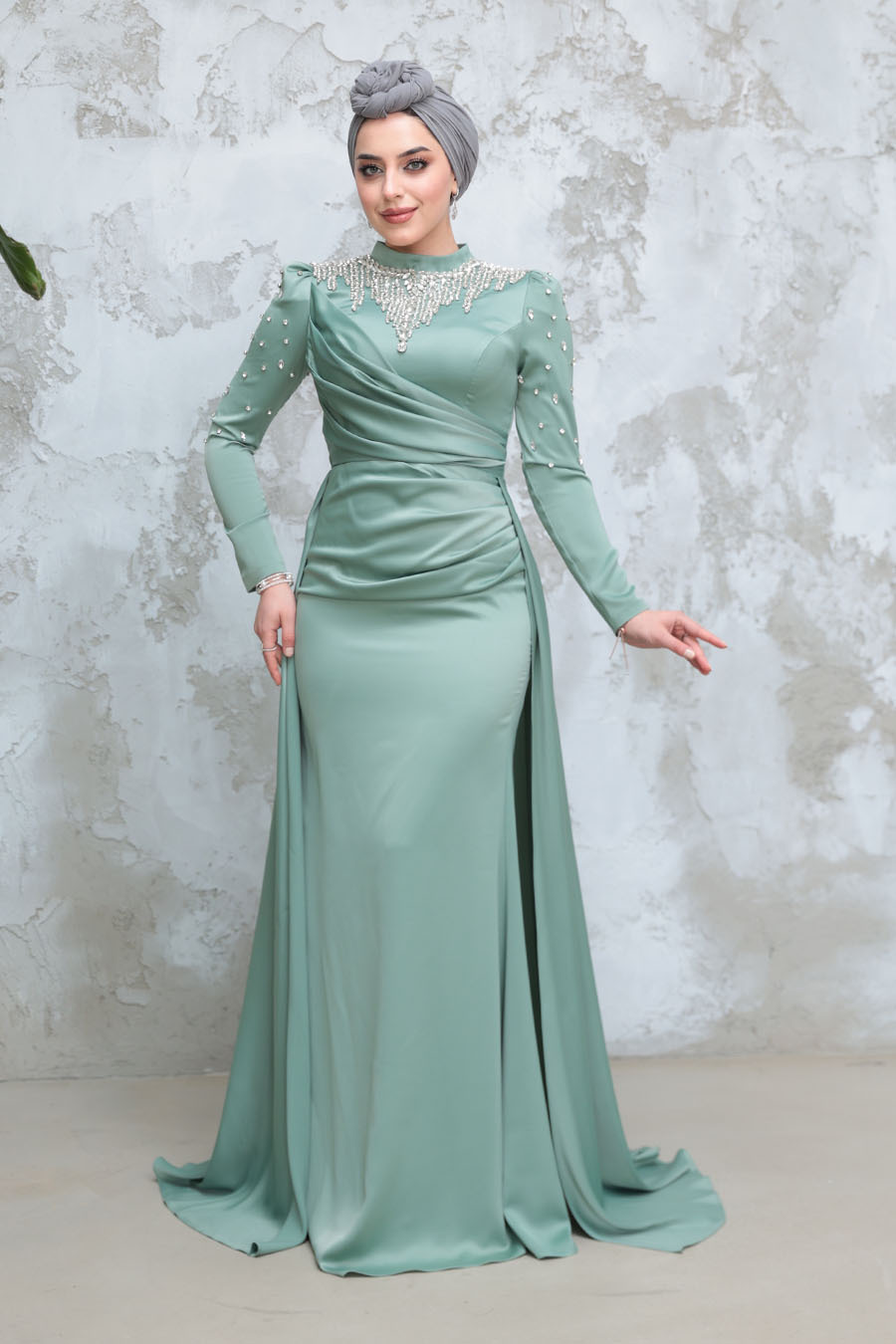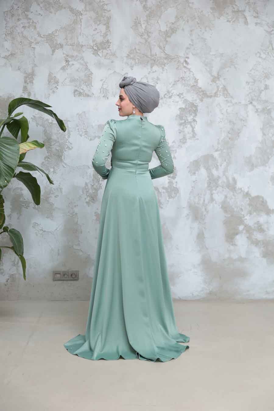 Ürün Özelliği:Dik yaka, uzun kollu, drape detaylı, kuyruklu, boncuk işlemeli ve arka ortadan fermuarlıdır.