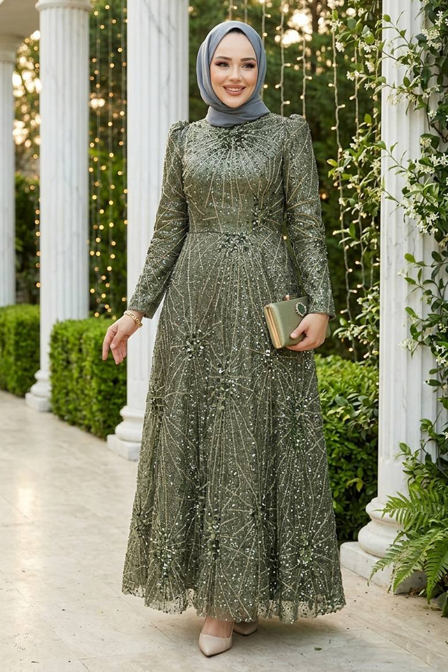 Ürün standart kalıp olup normalde kullandığınız bedeni sipariş vermeniz tavsiye olunur. Özel günler, düğün, nişan, söz, davet ve mezuniyet için aradığınız tesettürlü abiye elbisedir.