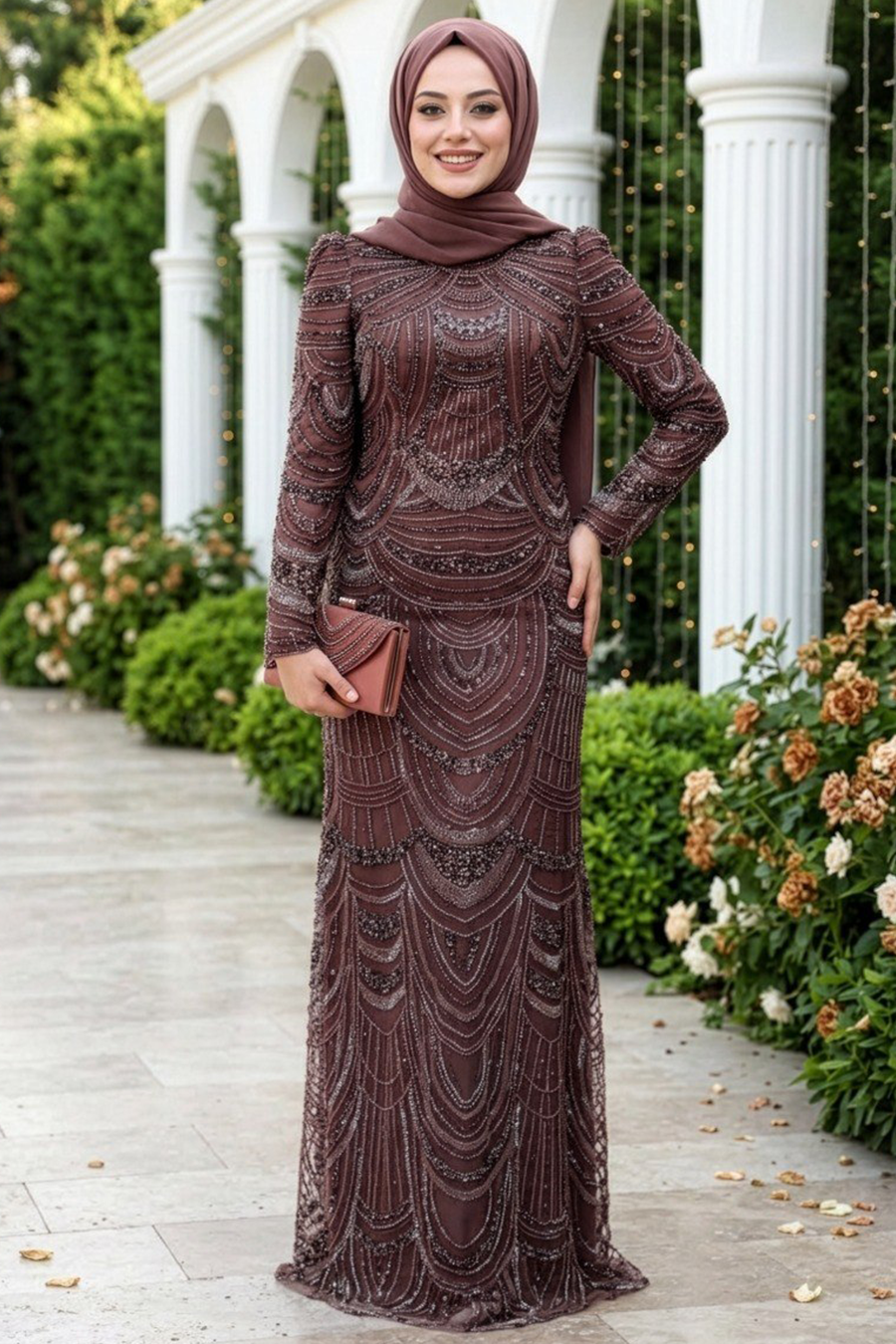 Tesettürlü Abiye Elbise - Boncuk İşlemeli Kahverengi Tesettür Abiye Elbise 51636KH