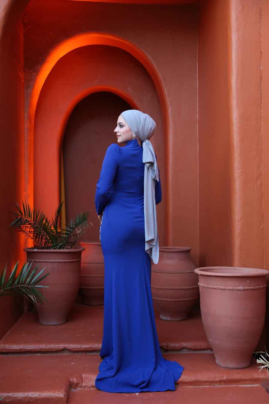 Tesettürlü Abiye Elbise - Boncuk İşlemeli Sax Mavisi Tesettür Abiye Elbise 4964SX