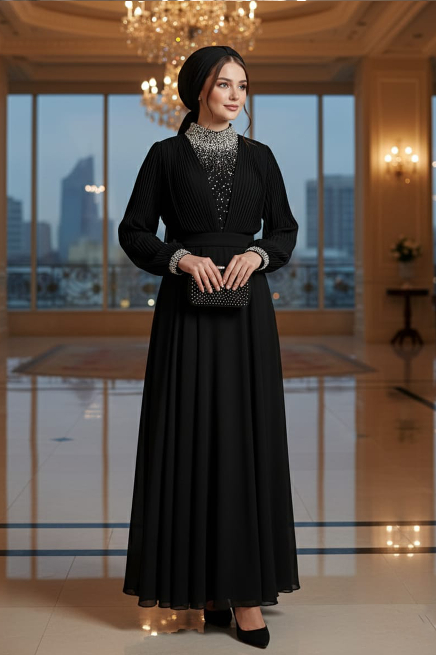 Ürün Özelliği: Sıfır yaka, uzun kollu, kolları pileli, inci işlemeli, astarlı ve arka ortadan fermuarlıdır.