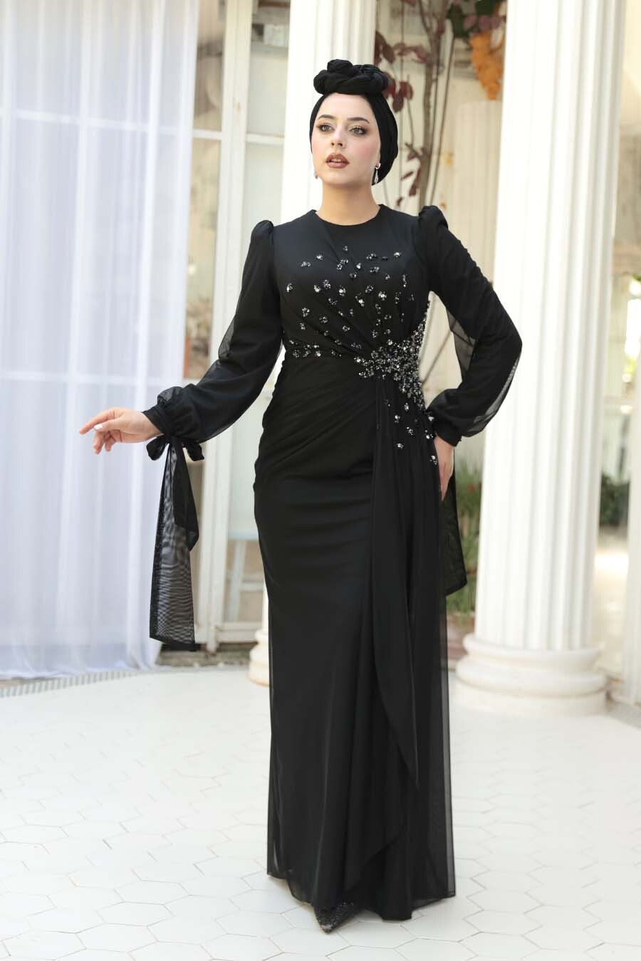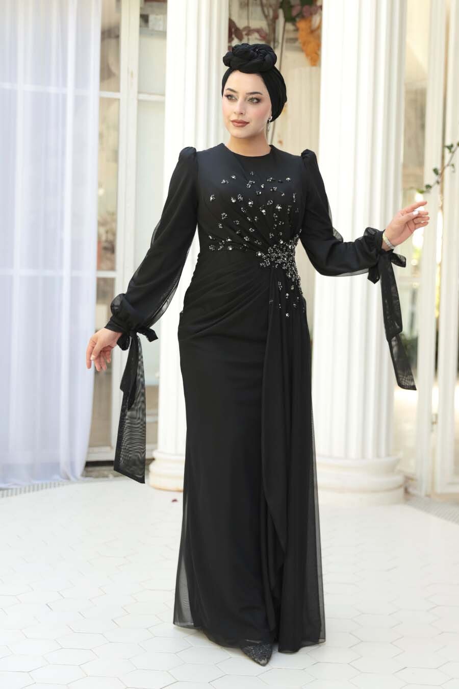 Ürün Özelliği:Sıfır yaka, omuzları büzgülü, uzun kollu, kol ucu bağlamalı, boncuk işlemeli, drape detaylı, astarlı ve arka ortadan fermuarlıdır.