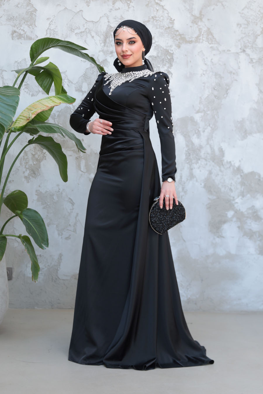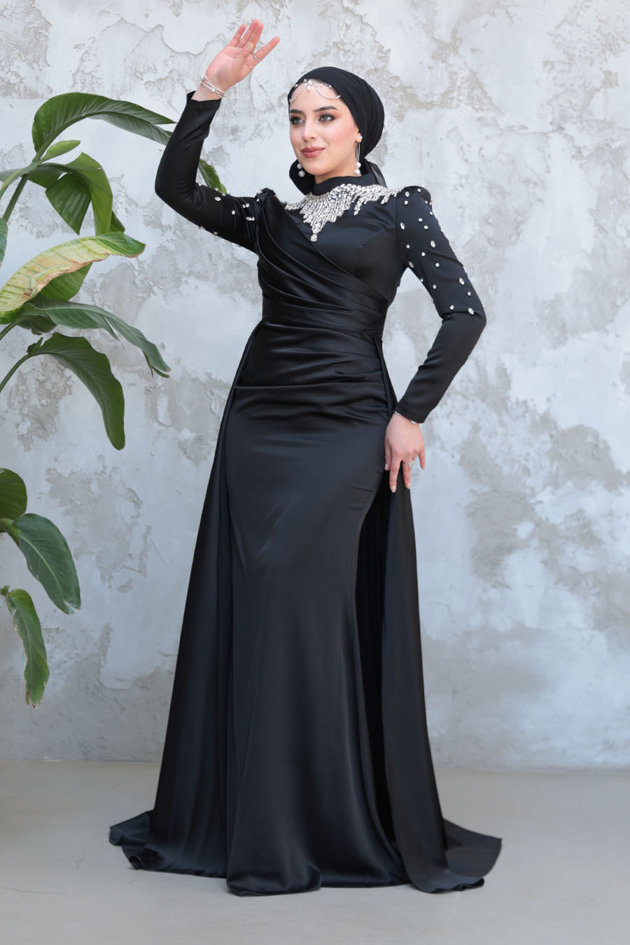 Ürün Özelliği:Dik yaka, uzun kollu, drape detaylı, kuyruklu, boncuk işlemeli ve arka ortadan fermuarlıdır.
