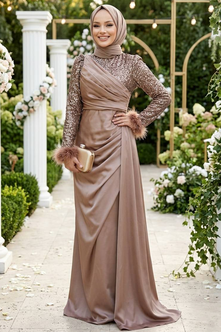 Ürün standart kalıp olup normalde kullandığınız bedeni sipariş vermeniz tavsiye olunur. Özel günler, düğün, nişan, söz, davet ve mezuniyet için aradığınız tesettürlü abiye elbisedir.