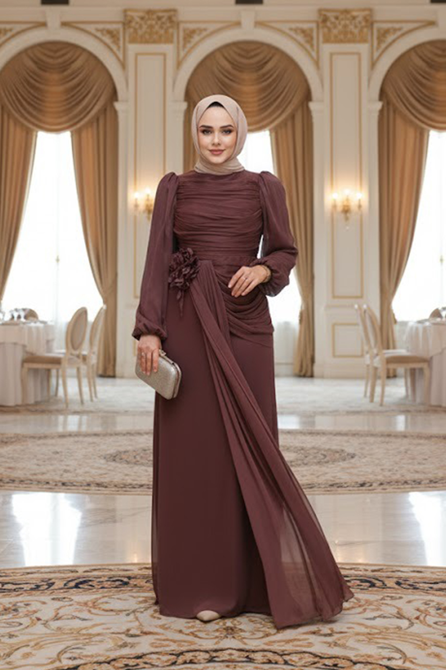 Ürün standart kalıp olup normalde kullandığınız bedeni sipariş vermeniz tavsiye olunur. Özel günler, düğün, nişan, söz, davet ve mezuniyet için aradığınız tesettürlü abiye elbisedir.