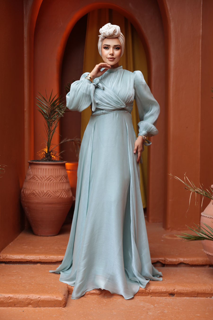 Tesettürlü Abiye Elbise - Drape Detaylı Mint Tesettür Abiye Elbise 4823MINT