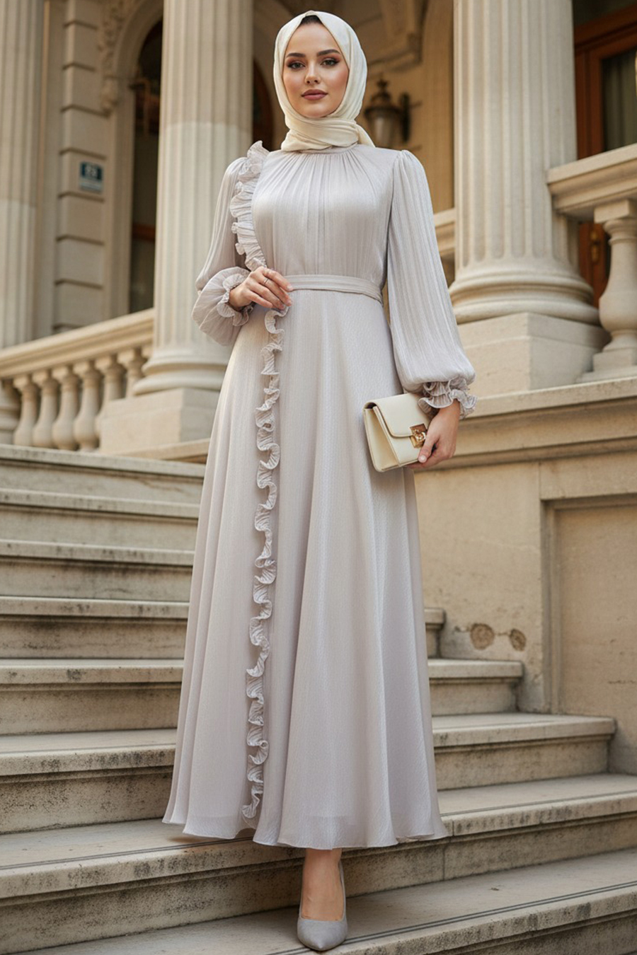 Ürün standart kalıp olup normalde kullandığınız bedeni sipariş vermeniz tavsiye olunur. Özel günler, düğün, nişan, söz, davet ve mezuniyet için aradığınız tesettürlü abiye elbisedir.