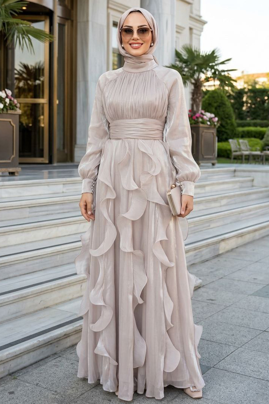 Ürün standart kalıp olup normalde kullandığınız bedeni sipariş vermeniz tavsiye olunur. Özel günler, düğün, nişan, söz, davet ve mezuniyet için aradığınız tesettürlü abiye elbisedir.