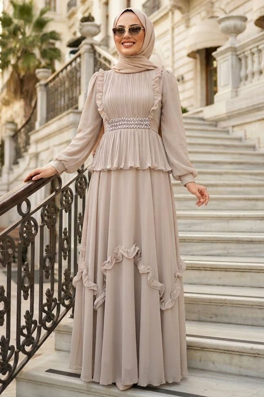 Ürün Özelliği: Dik yaka, uzun kollu, manşetli, pile detaylı, arka ortadan fermuarlı, astarlı, fırfır detaylı ve boncuk detaylıdır.