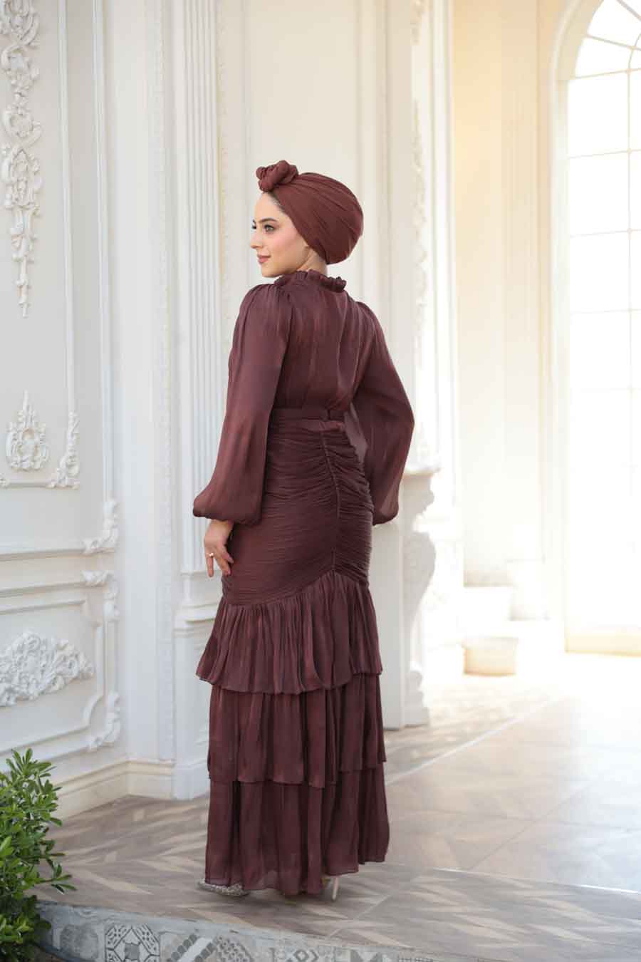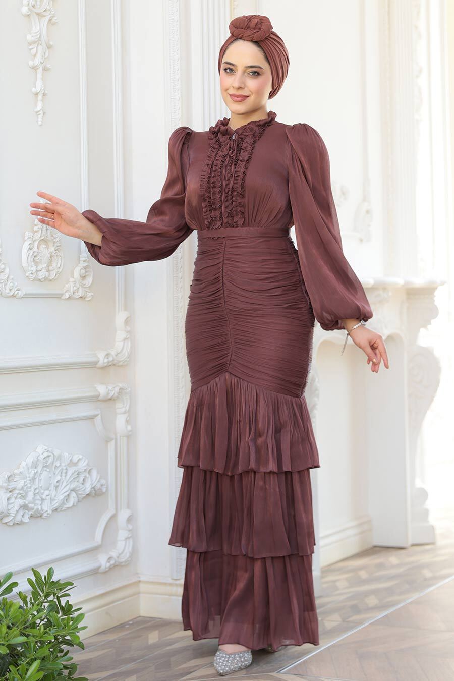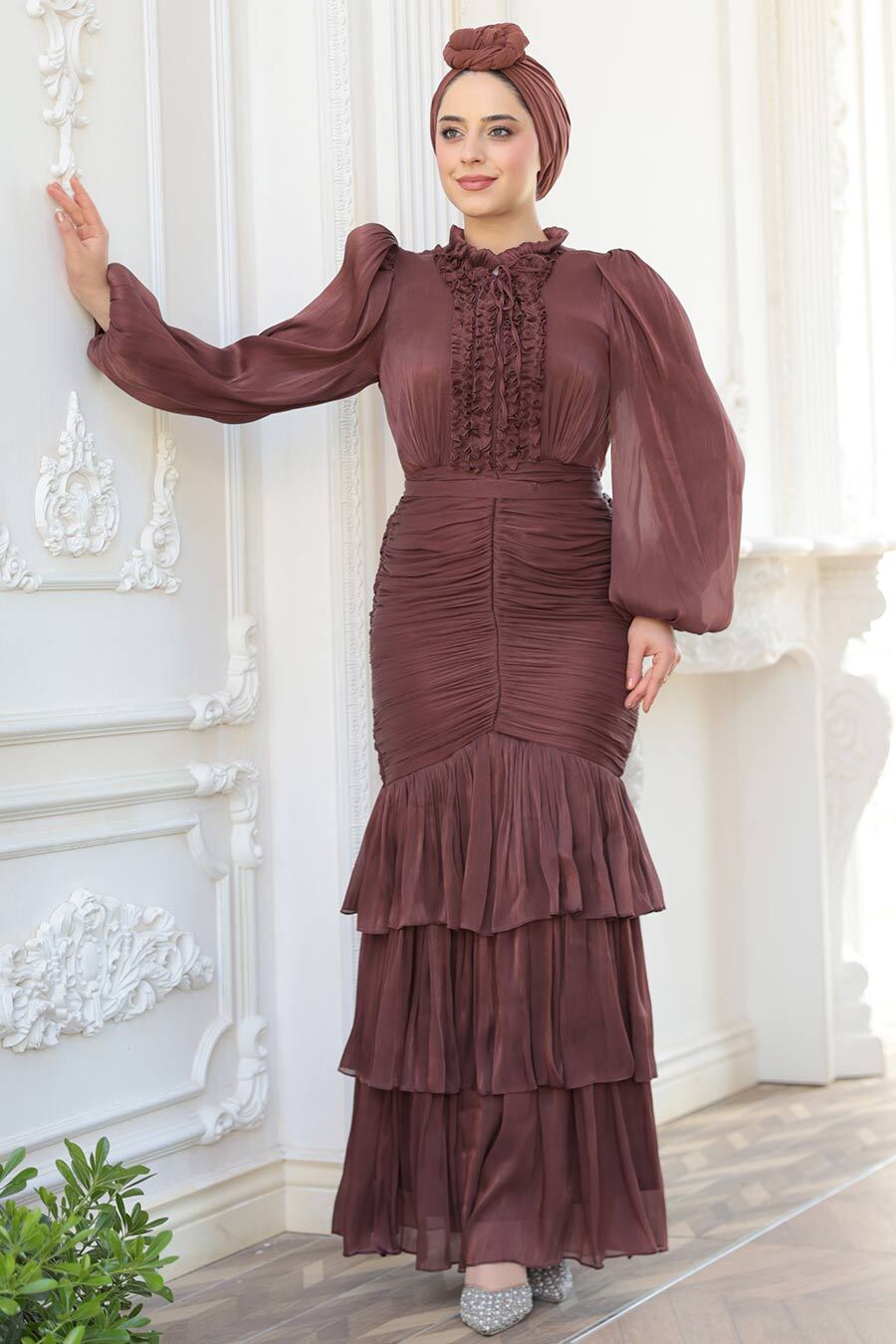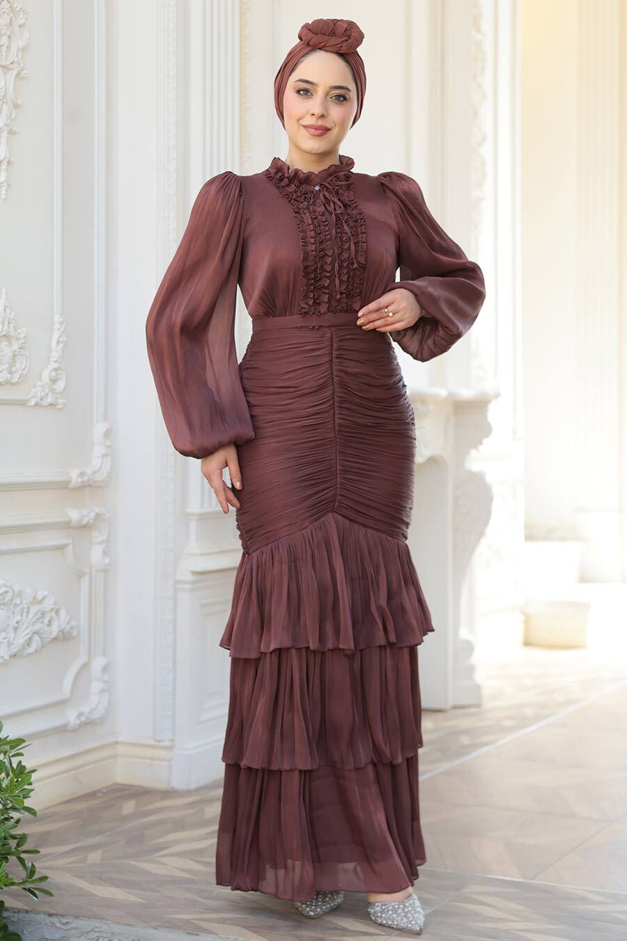 Tesettürlü Abiye Elbise - Fırfır Detaylı Kahverengi Tesettür Abiye Elbise 50271KH