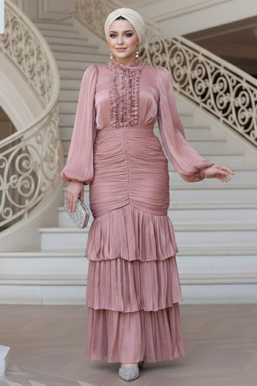Kumaş Özelliği: %100 Polyester kumaştan üretilmiştir.Ürün Özelliği: Dik yaka, uzun kollu, kol ucu lastikli, yakası bağcıklı, omuzları büzgülü, drapeli, kendi kumaşından kemerli, fırfır detaylı, kendi kumaşından kemerli, etek ucu kat volanlı ve astarlıdır.