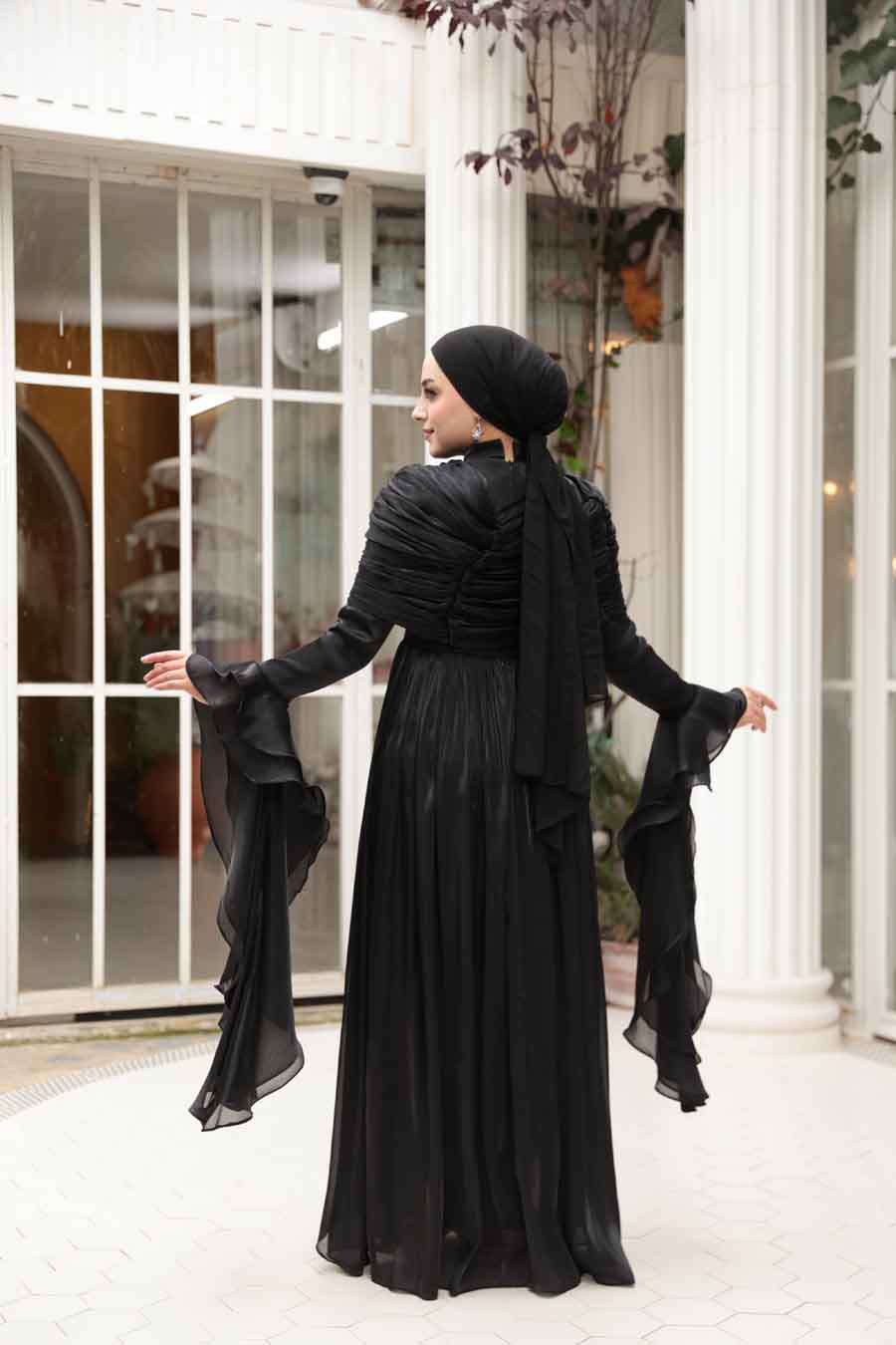 Kumaş Özelliği: Işıltılı kumaştan üretilmiştir.Ürün Özelliği: Dik yaka, uzun kollu, kol ucu volanlı, arka ortadan fermuarlı, astarlı, drape ve fırfır detaylıdır.