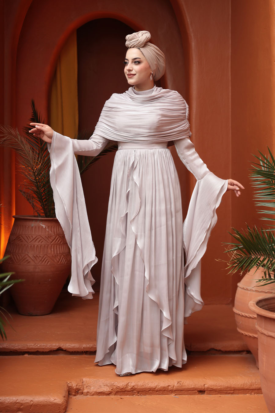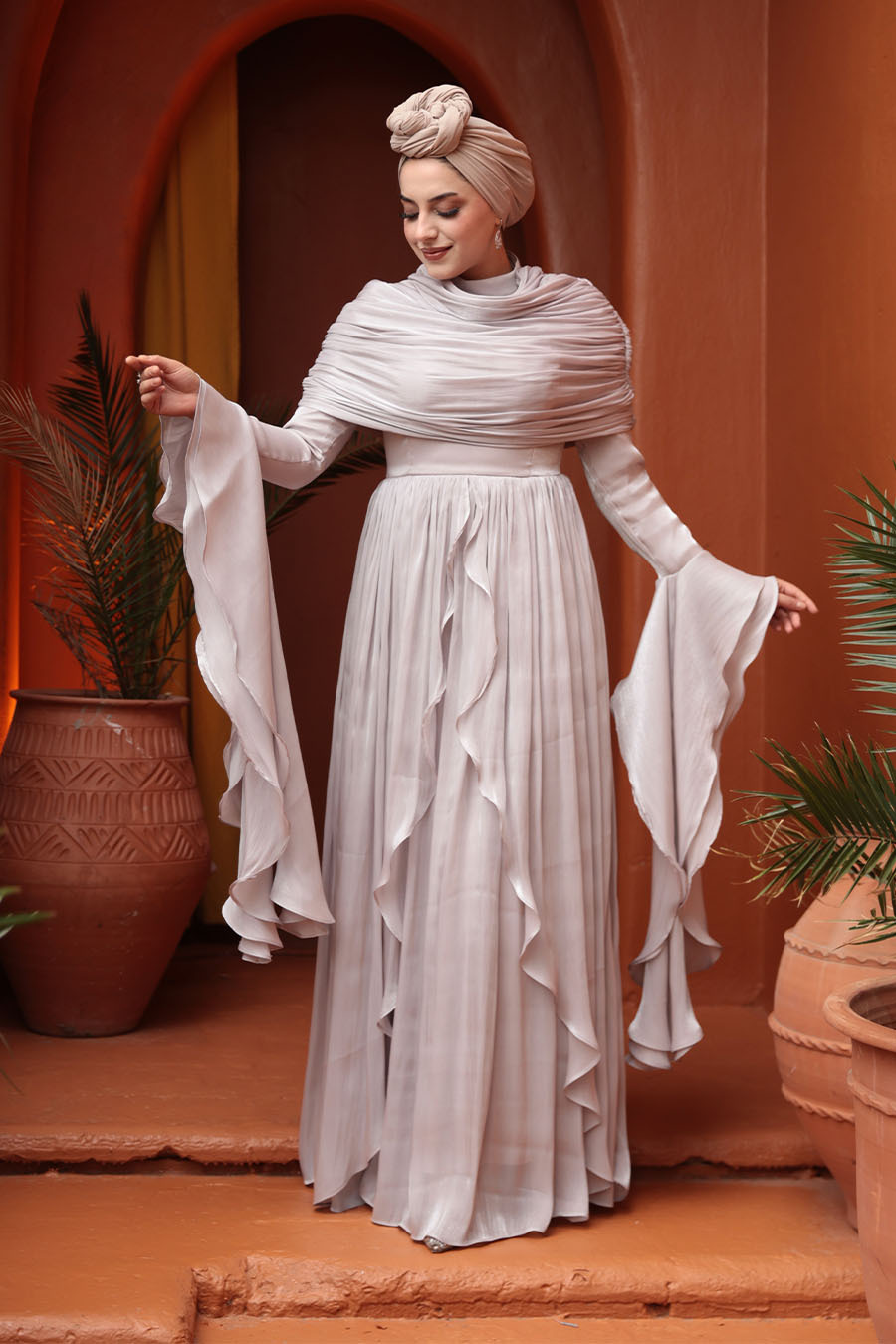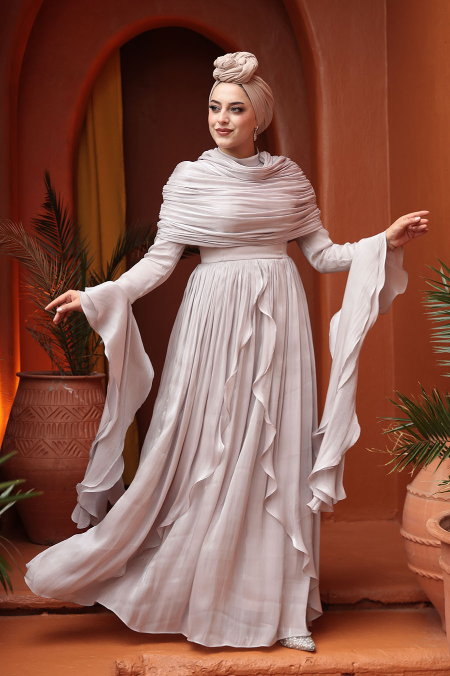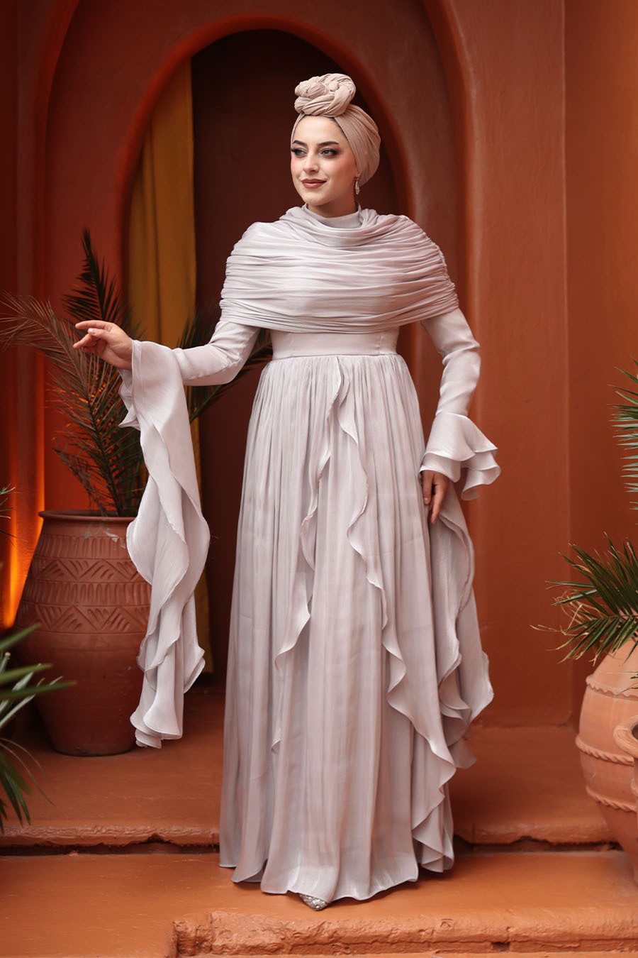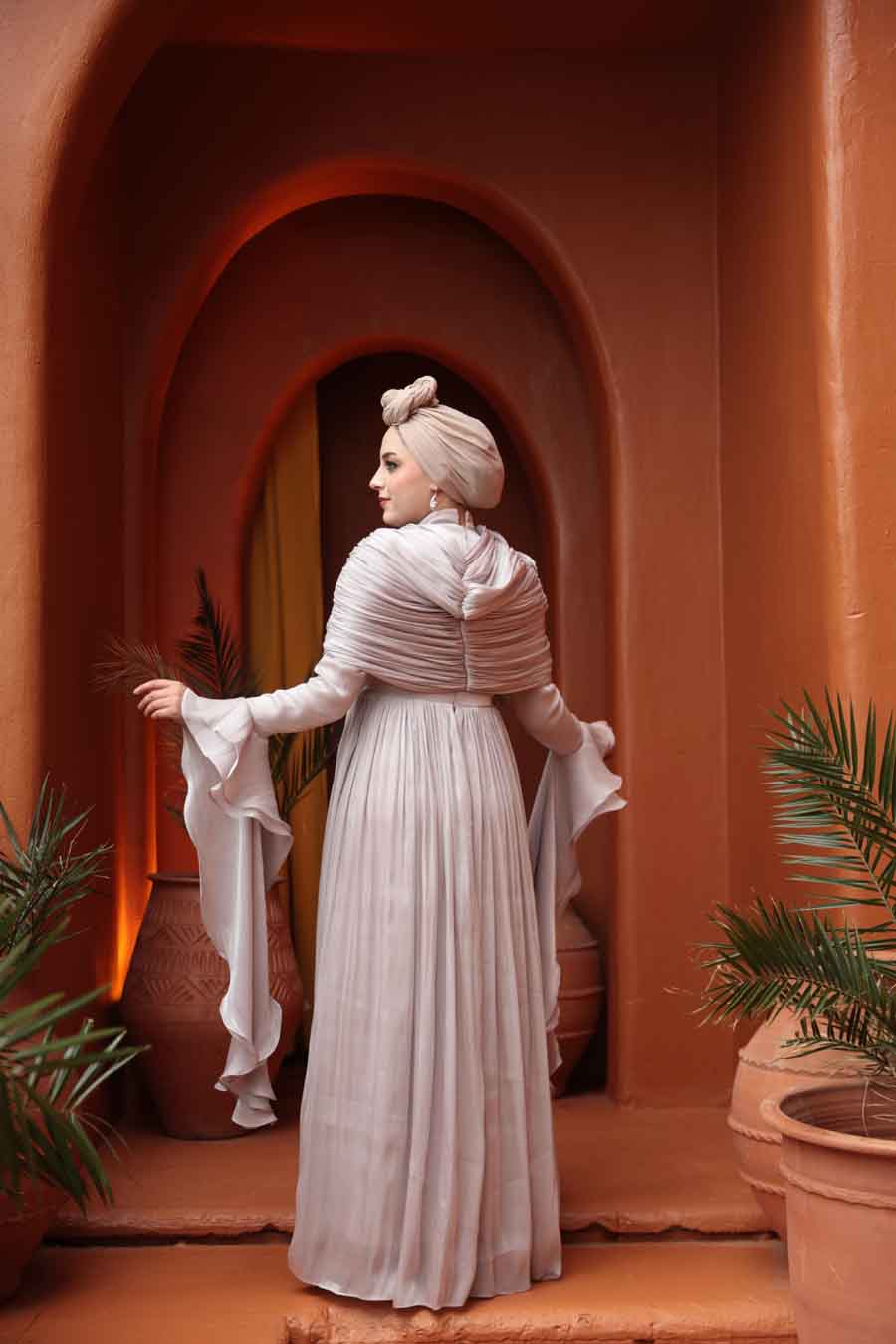 Kumaş Özelliği: Işıltılı kumaştan üretilmiştir.Ürün Özelliği: Dik yaka, uzun kollu, kol ucu volanlı, arka ortadan fermuarlı, astarlı, drape ve fırfır detaylıdır.