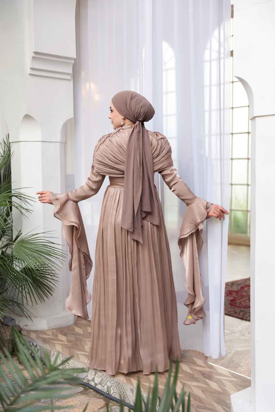 Kumaş Özelliği: Işıltılı kumaştan üretilmiştir.Ürün Özelliği: Dik yaka, uzun kollu, kol ucu volanlı, arka ortadan fermuarlı, astarlı, drape ve fırfır detaylıdır.