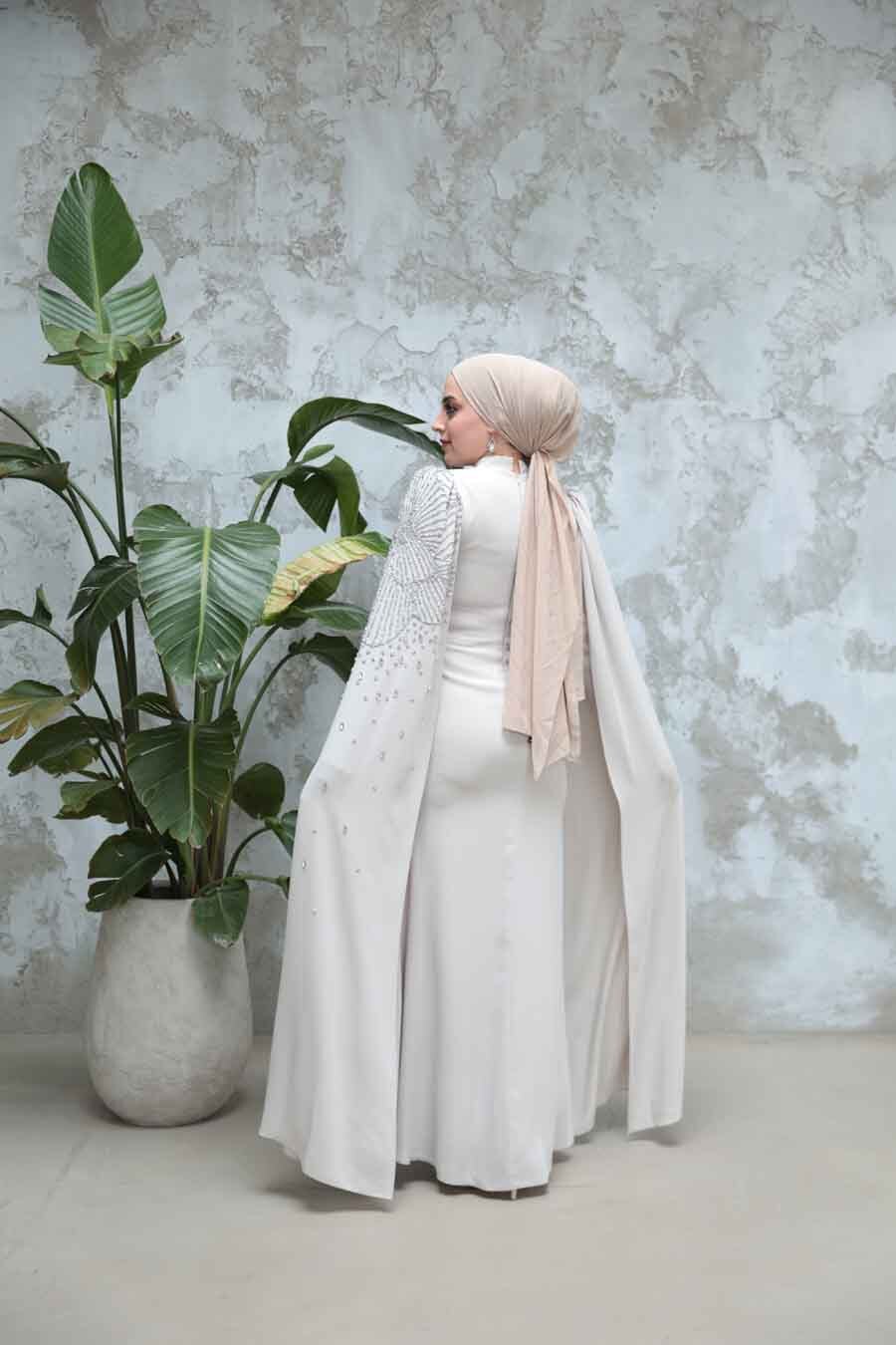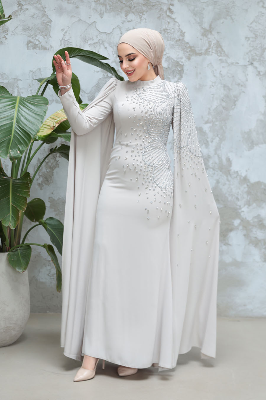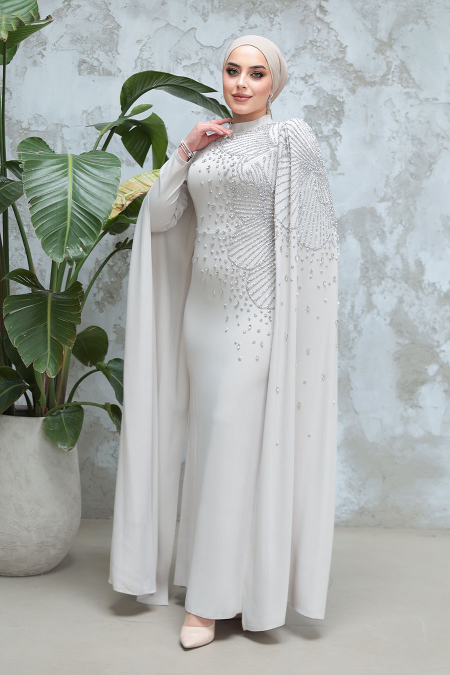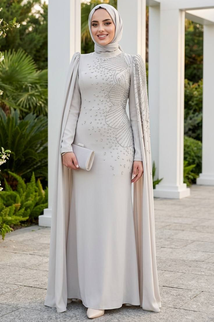 Ürün Özelliği:Dik yaka, uzun kollu, boncuk işlemeli, kolları pelerinli ve arka ortadan fermuarlıdır.