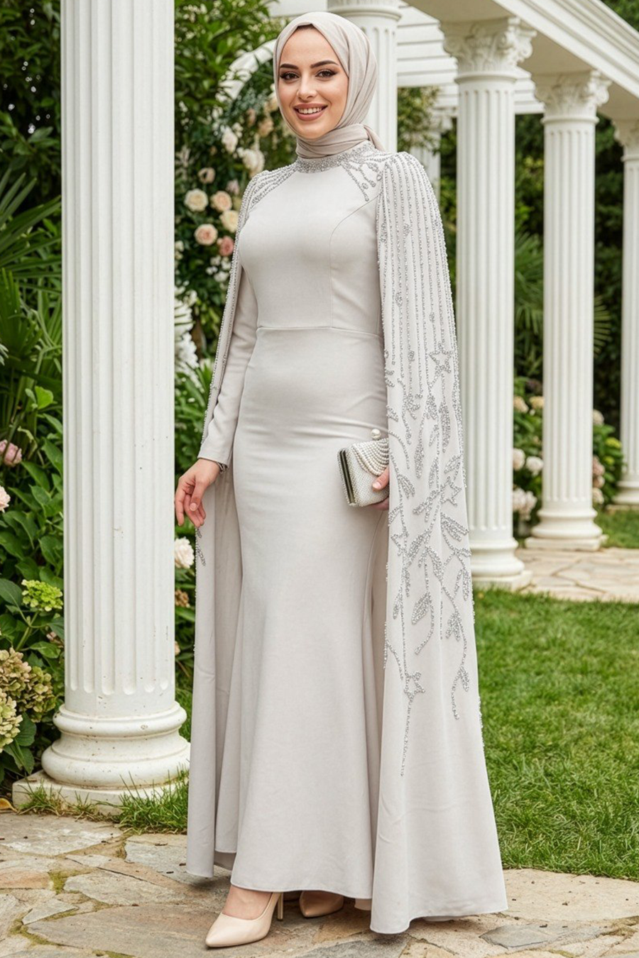 Ürün Özelliği:Dik yaka, uzun kollu, boncuk işlemeli, kolları pelerinli ve arka ortadan fermuarlıdır.