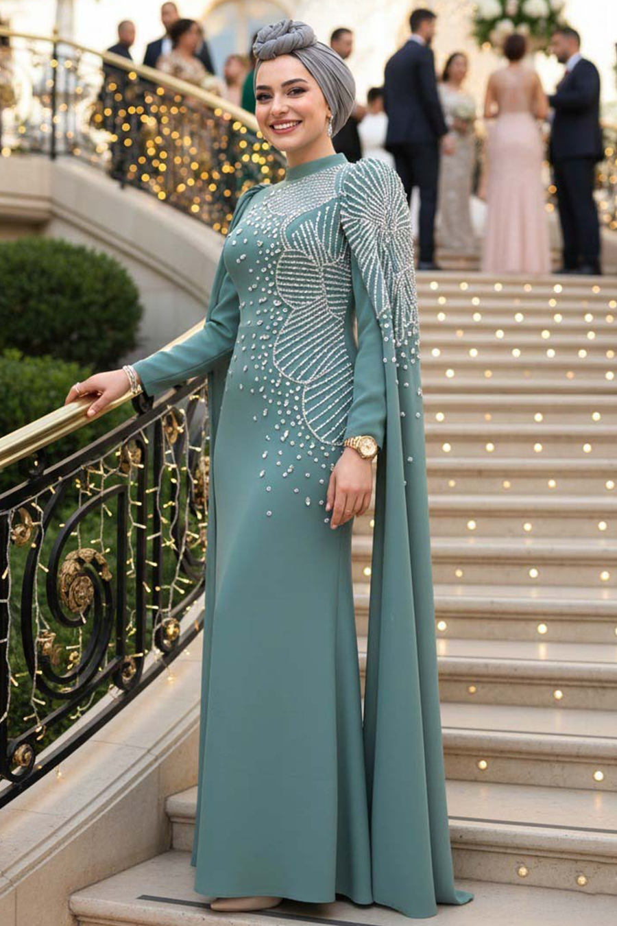 Ürün Özelliği:Dik yaka, uzun kollu, boncuk işlemeli, kolları pelerinli ve arka ortadan fermuarlıdır.