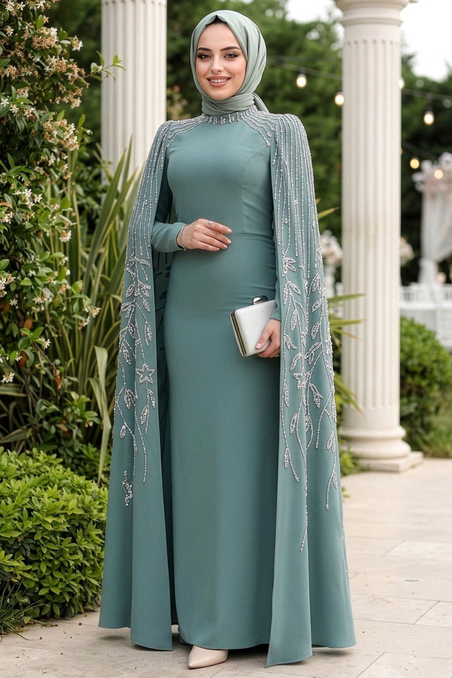 Ürün Özelliği:Dik yaka, uzun kollu, boncuk işlemeli, kolları pelerinli ve arka ortadan fermuarlıdır.