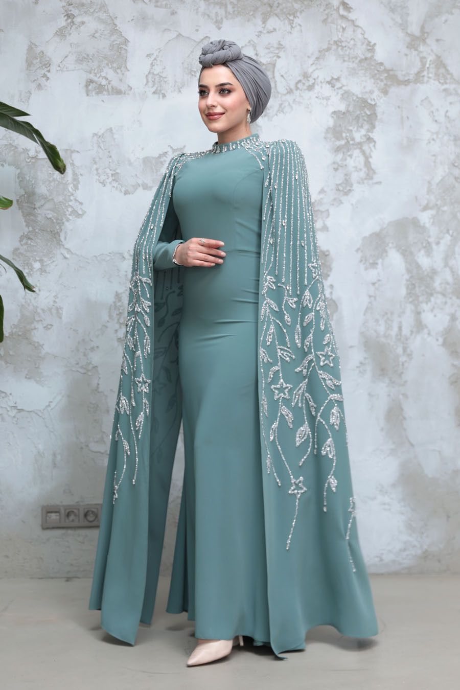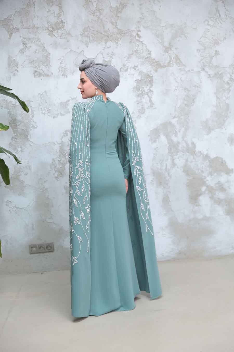 Ürün Özelliği: Dik yaka, uzun kollu, boncuk işlemeli, kolları pelerinli ve arka ortadan fermuarlıdır.