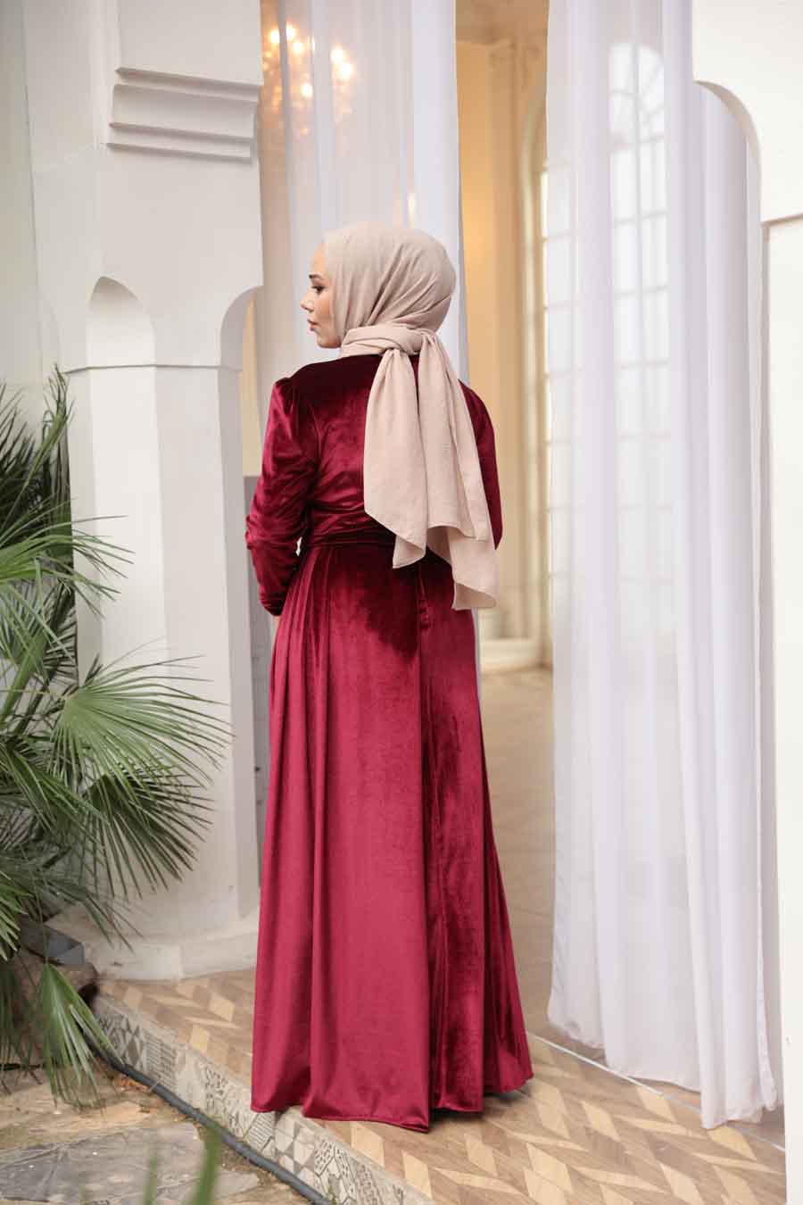 Kumaş Özelliği: Kadife kumaştan üretilmiştir.Ürün Özelliği: Sıfır yaka, uzun kollu, drape detaylı, kuyruklu ve arka ortadan fermuarlıdır.